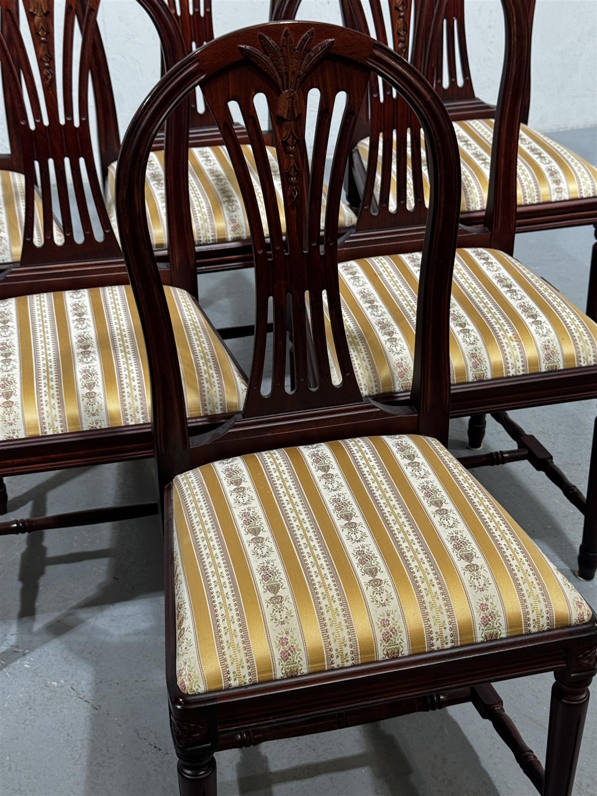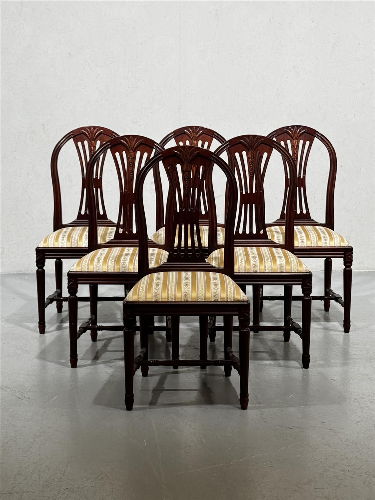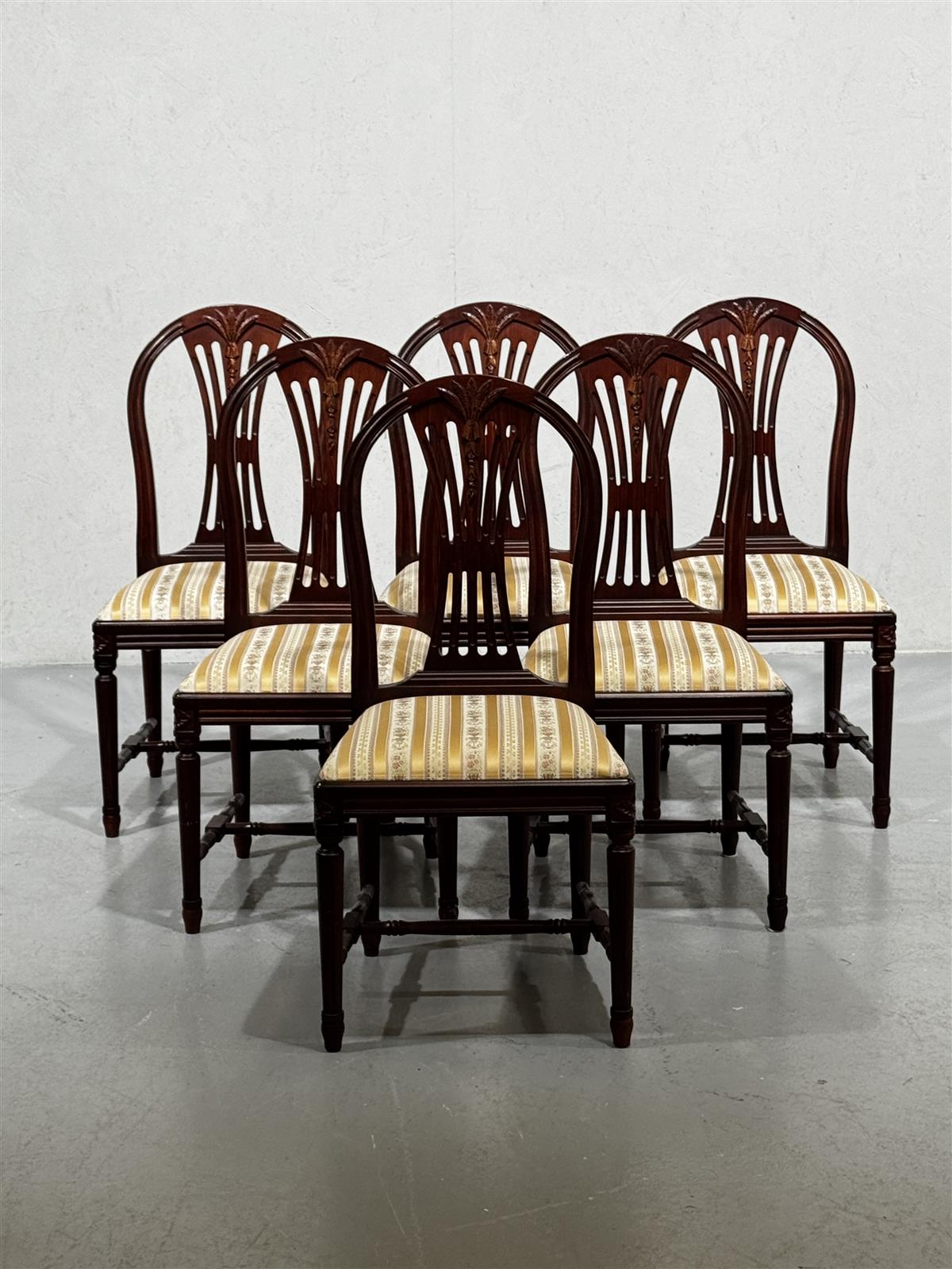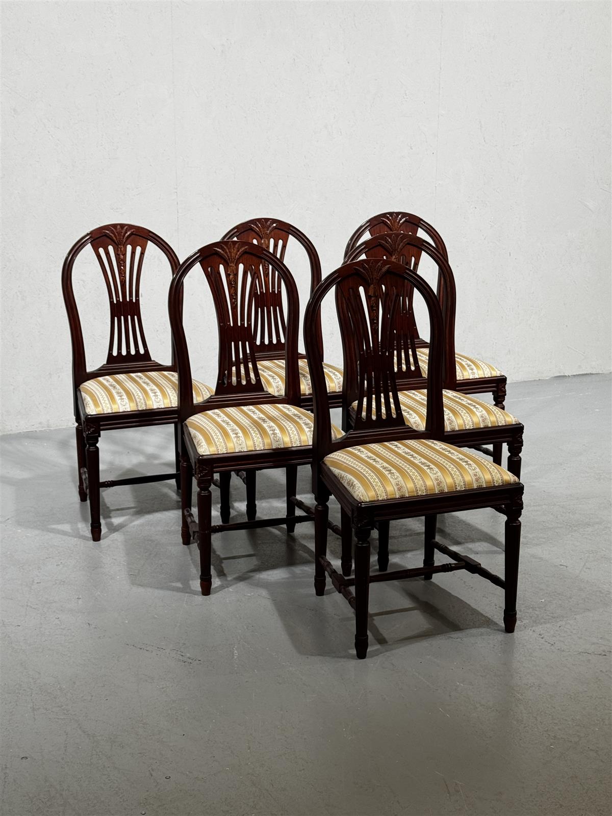 Tyylikkäät tähkäempire-tyyliset tuolit, joissa on kauniit kaarevat selkänojat ja koristeelliset yksityiskohdat. Tuolit on valmistettu tummasta puusta ja niissä on raidalliset kangasverhoillut istuimet, jotka tuovat lisää eleganssia kokonaisuuteen. Tuolit ovat hyvässä kunnossa.