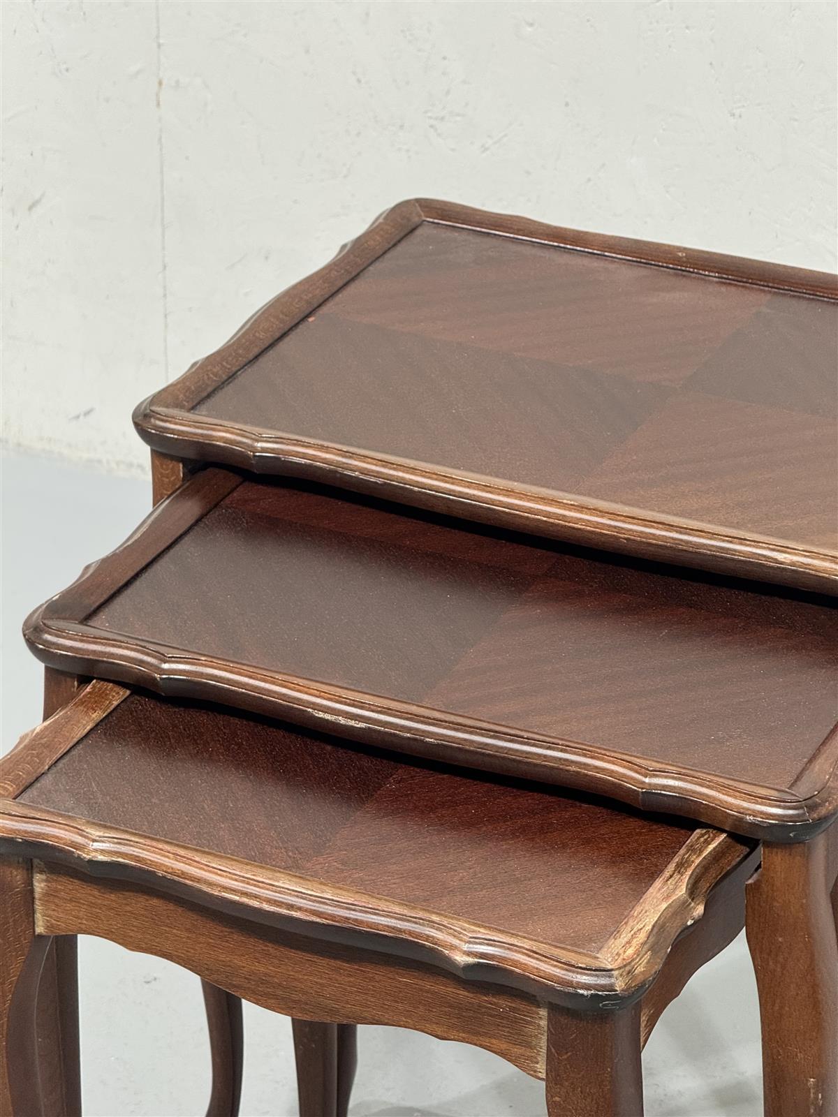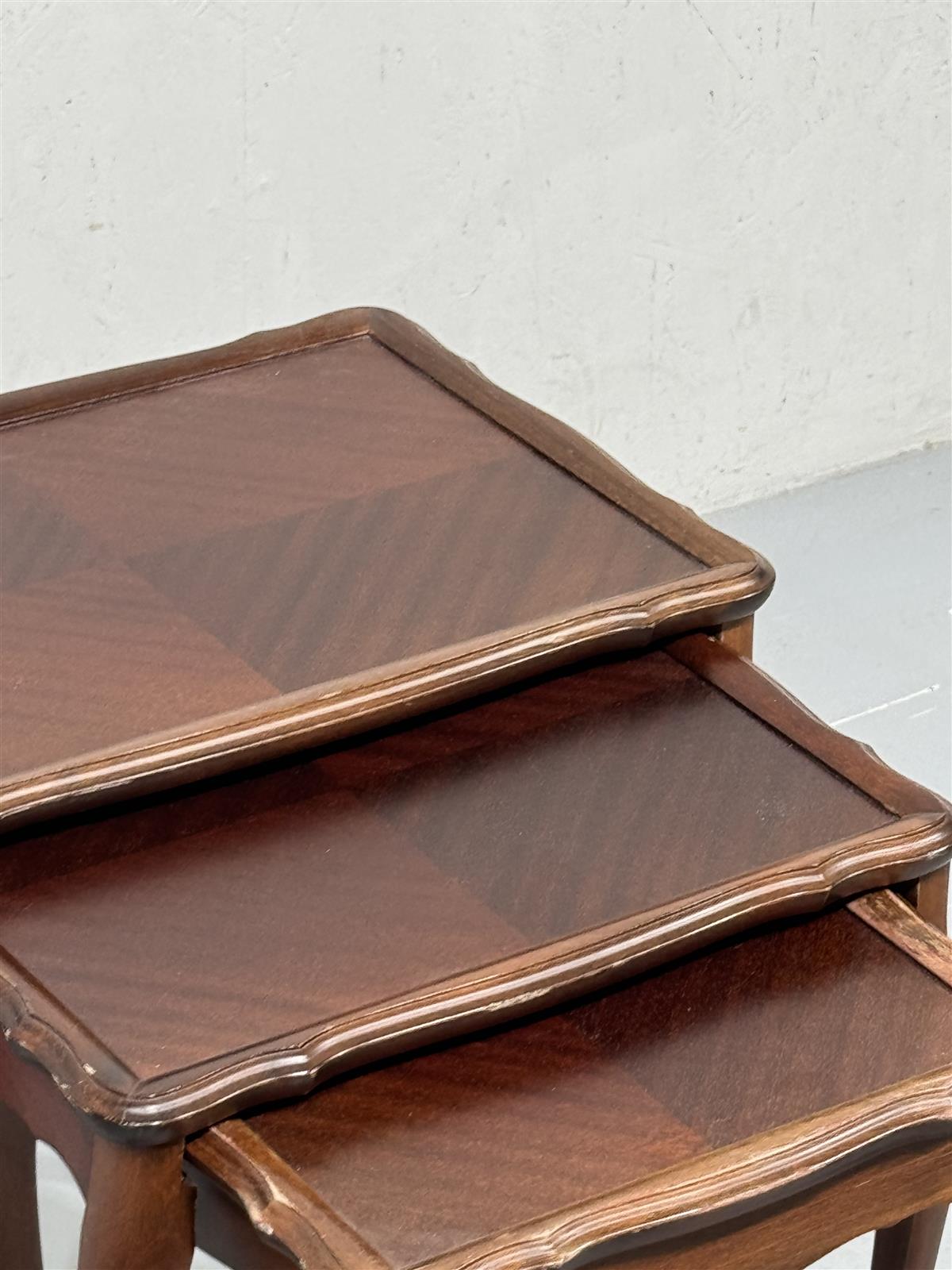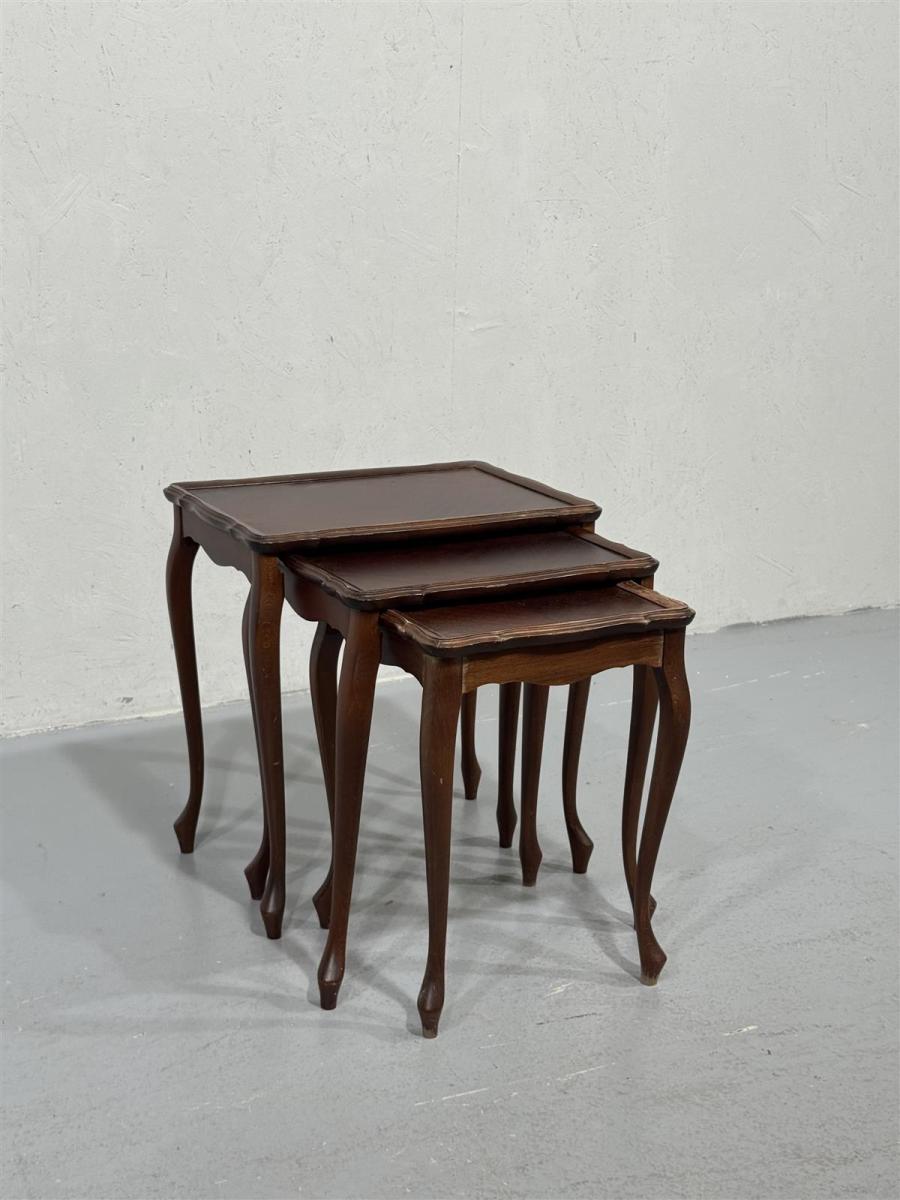 Talonpoikaisrokokoo sarjapöytä, joka koostuu kolmesta erikokoisesta pöydästä. Pöydät ovat valmistettu puusta ja niissä on kauniit kaarevat jalat, jotka tuovat esiin rokokoon tyylin piirteet. Pöytien pinnat ovat tummanruskeat ja niissä on hienovaraisia koristeellisia yksityiskohtia reunoissa.