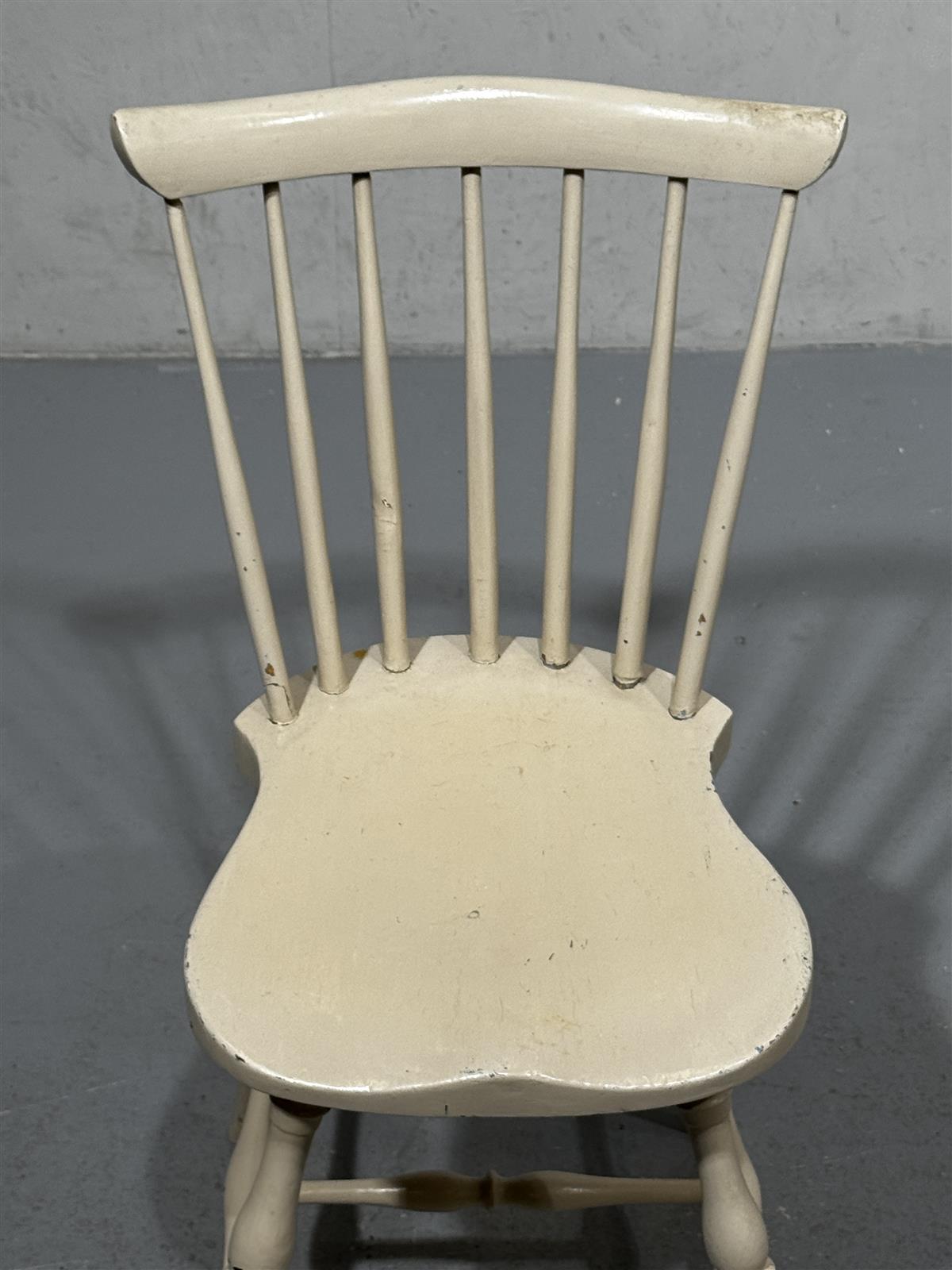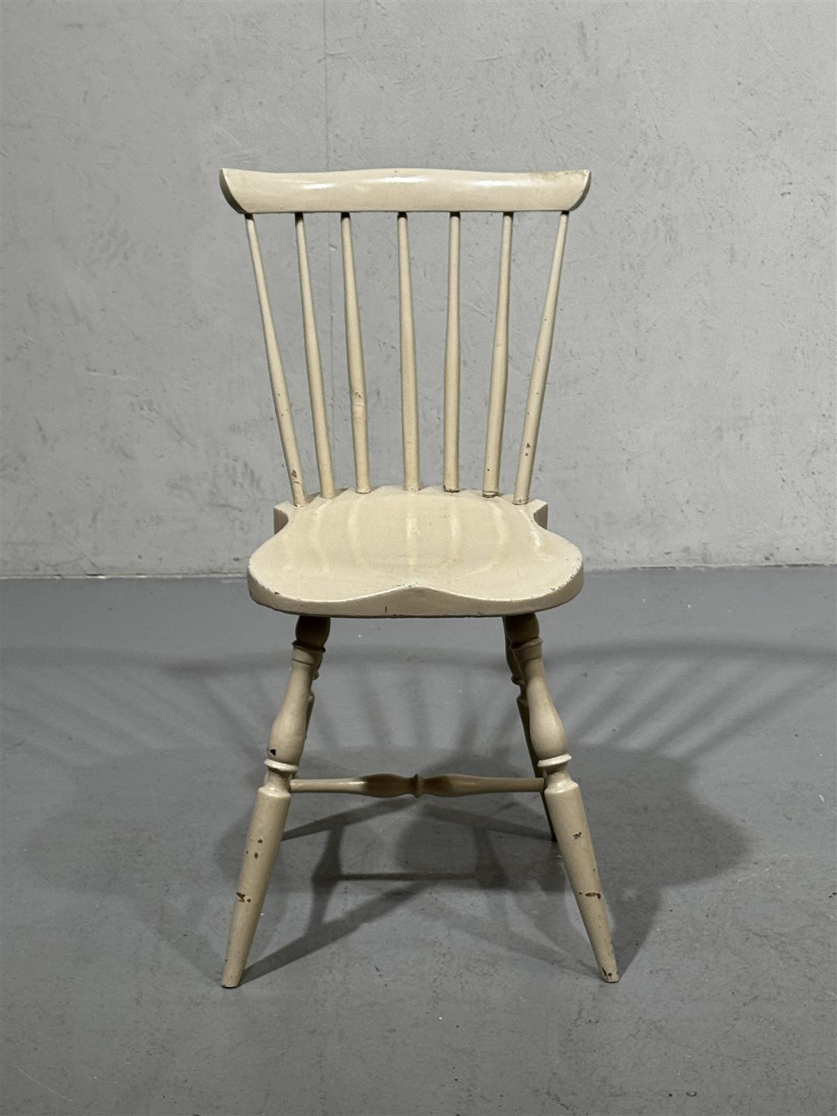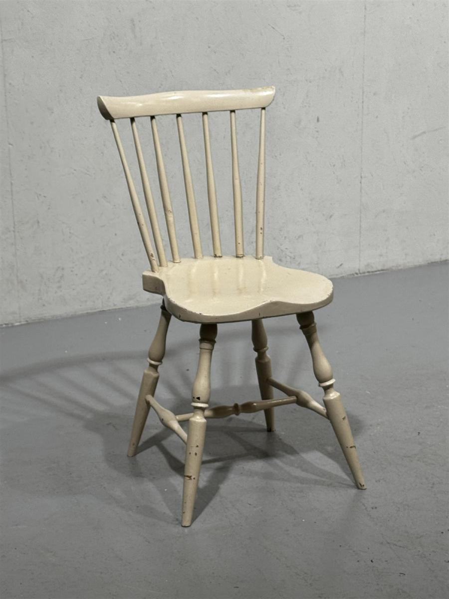 Tämä on antiikkinen, 1900 luvun alkupuolen vintage talonpoikaistuoli, joka on valmistettu puusta ja maalattu kerman väriseksi vaaleaksi. Tuolissa on perinteinen tyyli, istuimessa muotoilu, ja pystysuorat pinnat selkänojassa ja kaarevat jalat, jotka antavat sille klassisen ilmeen.