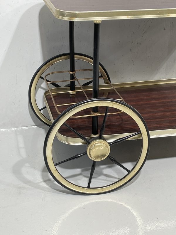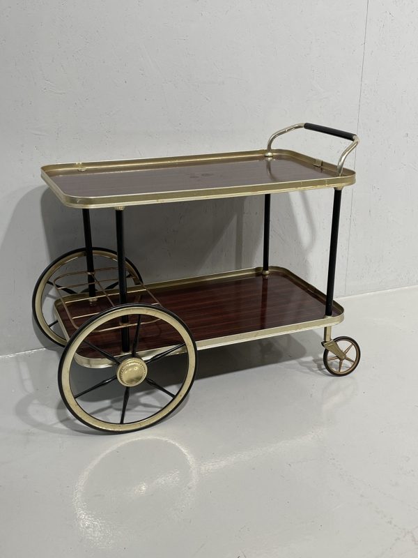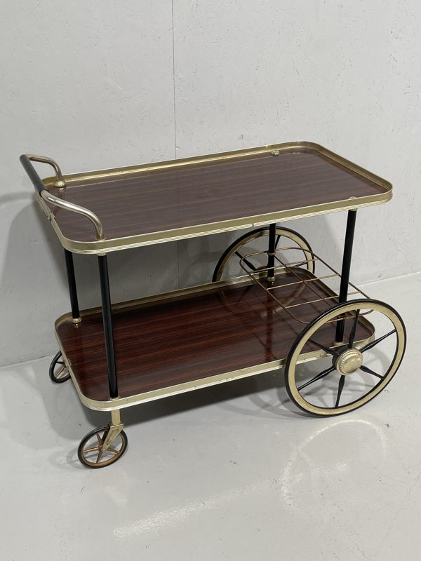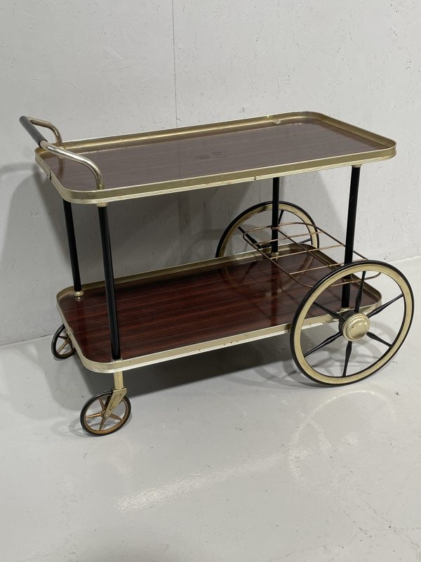 Tyyliä tarjoiluun retro-henkisellä messinkirunkoisella tarjoiluvaunulla. Kaksi tasoa, sirot pyörät alla kumeilla ja kuuden pullon pidike alatasossa. Valmistettu arviolta 70 luvulla.