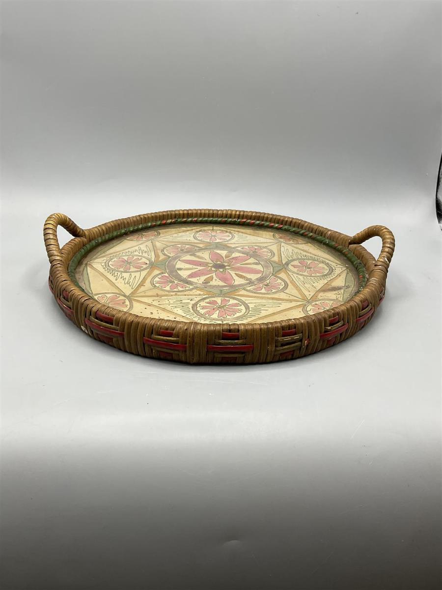 Tarjottimessa on näkyvissä kulumisen merkkejä, kuten naarmuja ja värin haalistumista. Rottinkireunus on hieman kulunut, mutta edelleen tukeva.