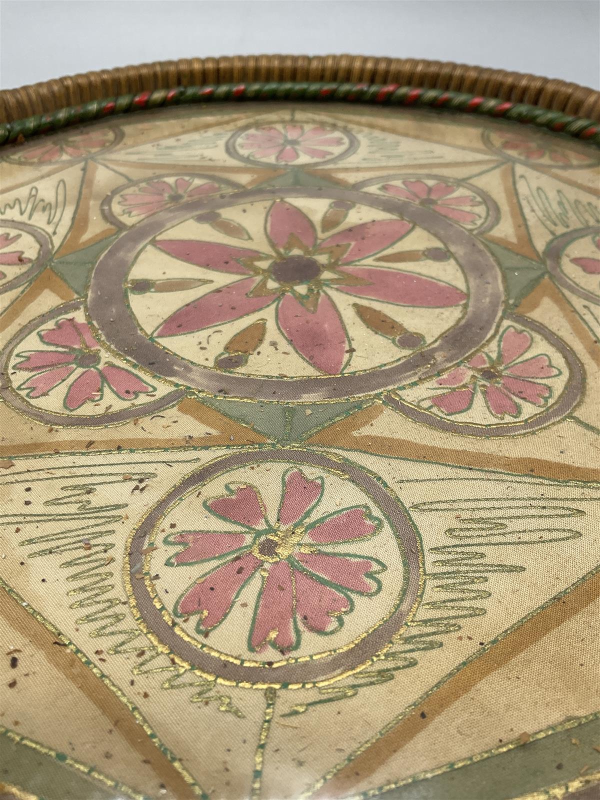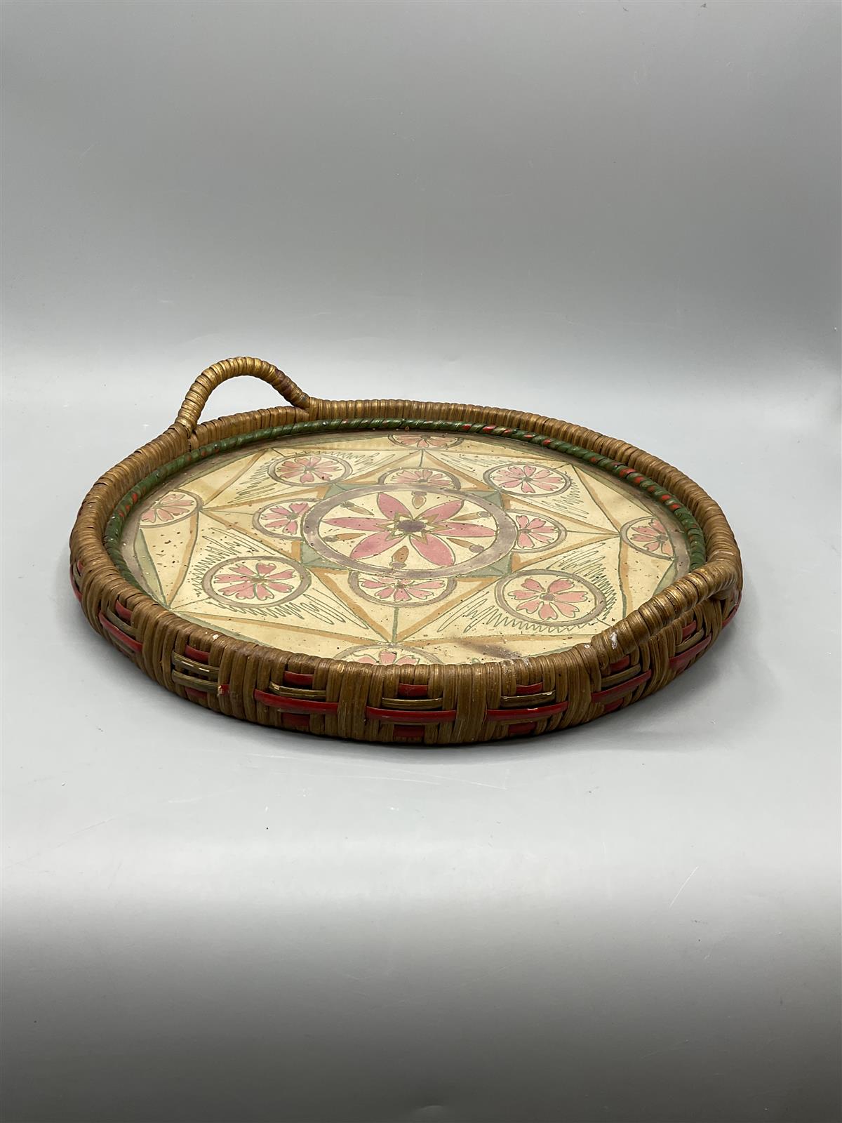 Pyöreä tarjotin, jossa on rottinkireunus ja kahvat. Keskellä on värikäs kukkakuviointi lasilevyn alla.