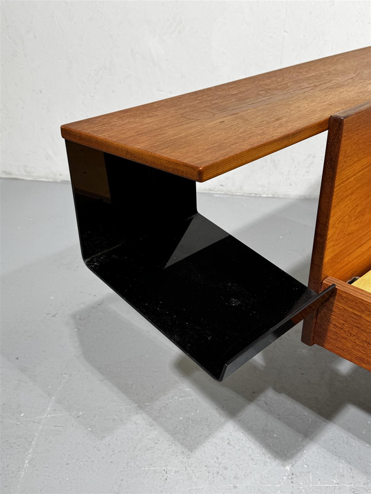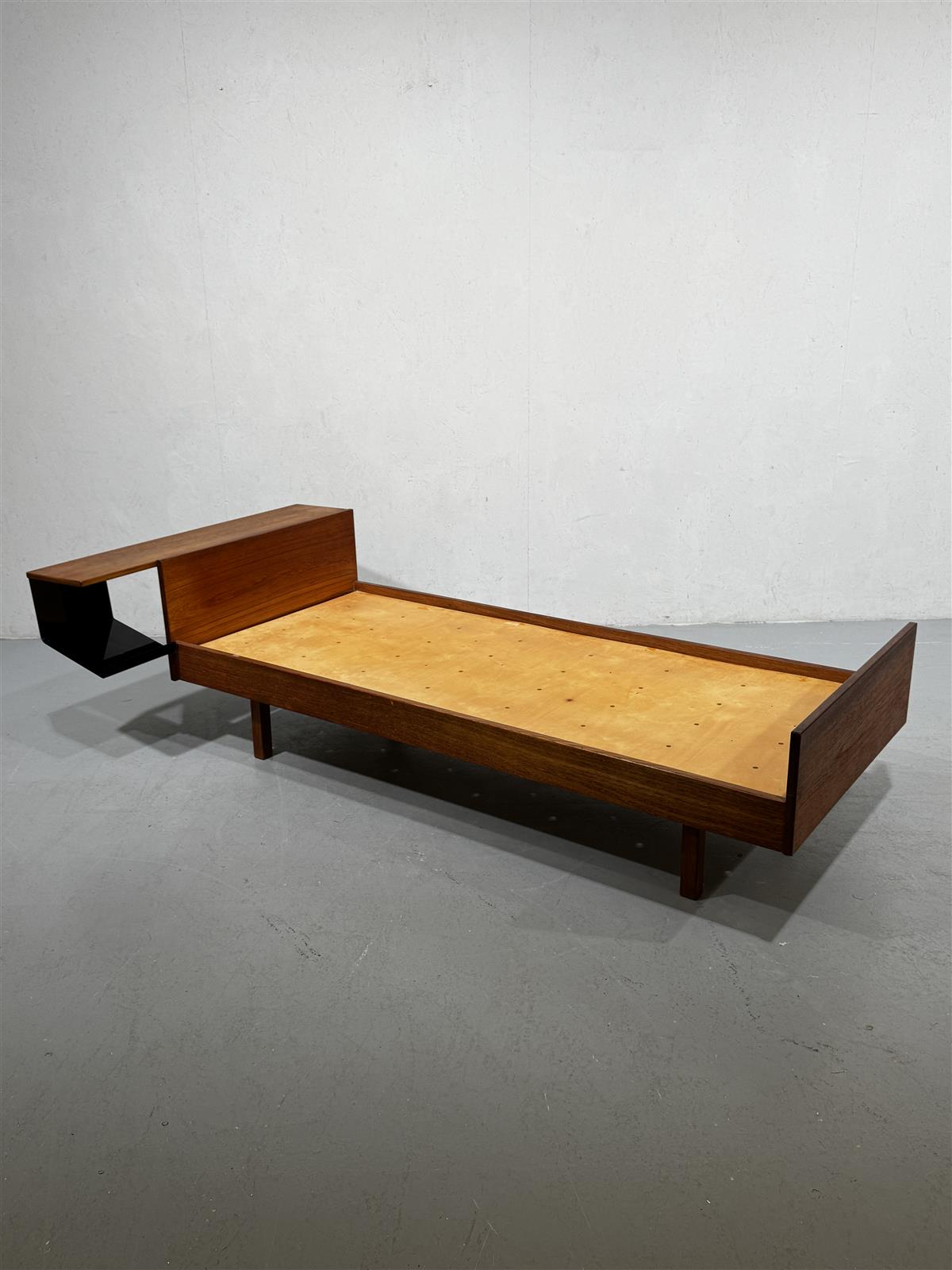 Tyylikäs 60-luvun vaneripohjainen sänky, jossa on tiikkipuinen runko ja musta akryylinen pidike vasemmalla. Sängyn muotoilu on yksinkertainen mutta toimiva, ja se sopii hyvin monenlaisiin sisustuksiin. Takana taso. Sisämitta 80cm x 200cm.