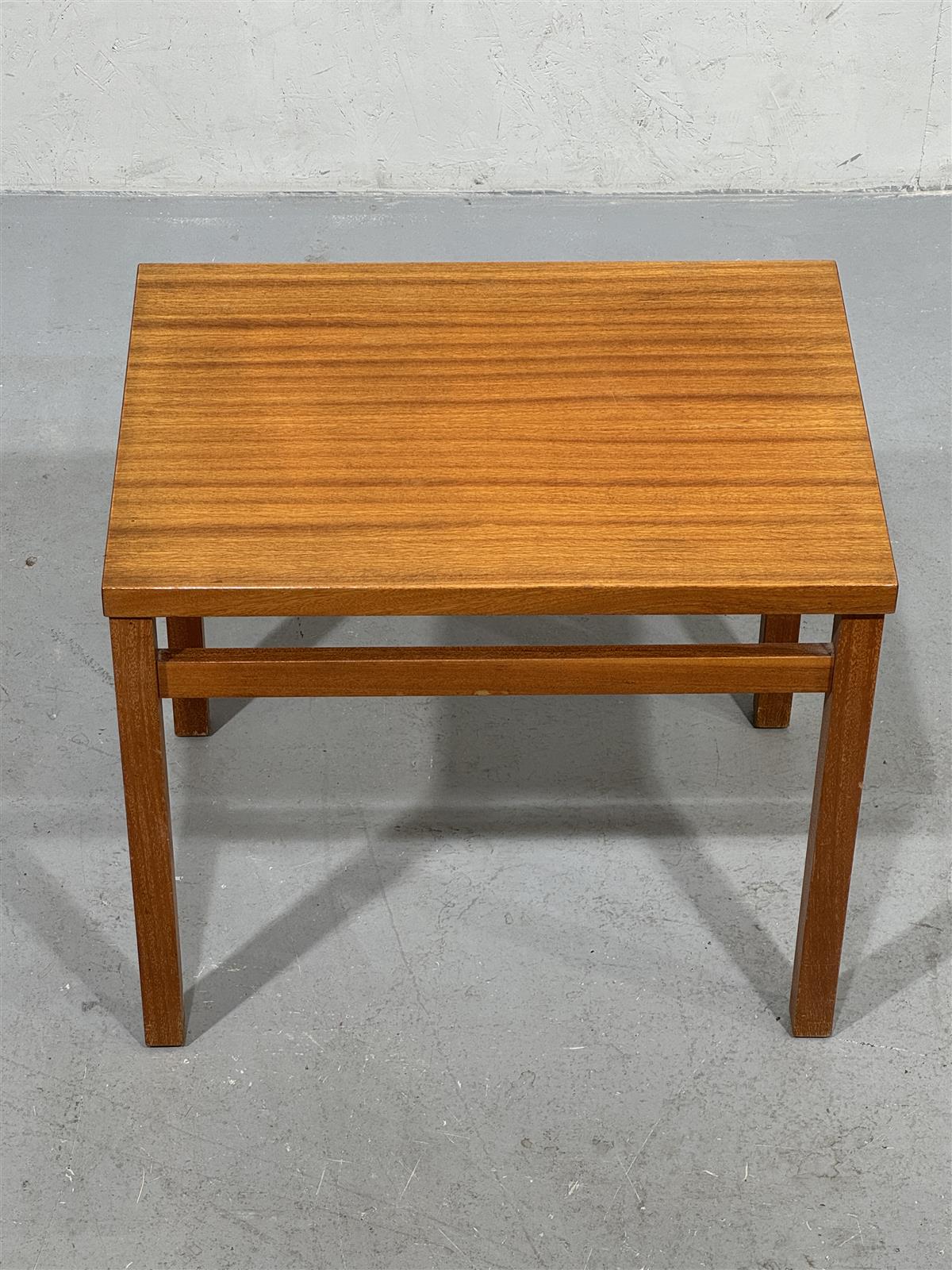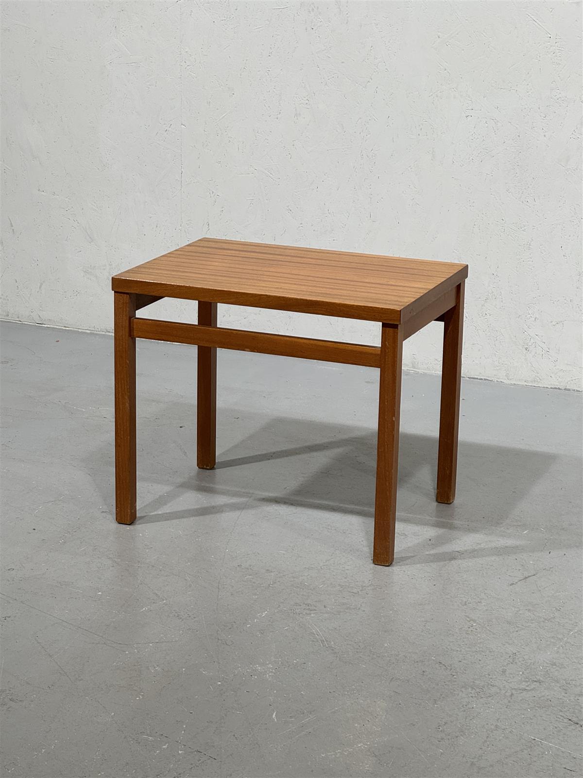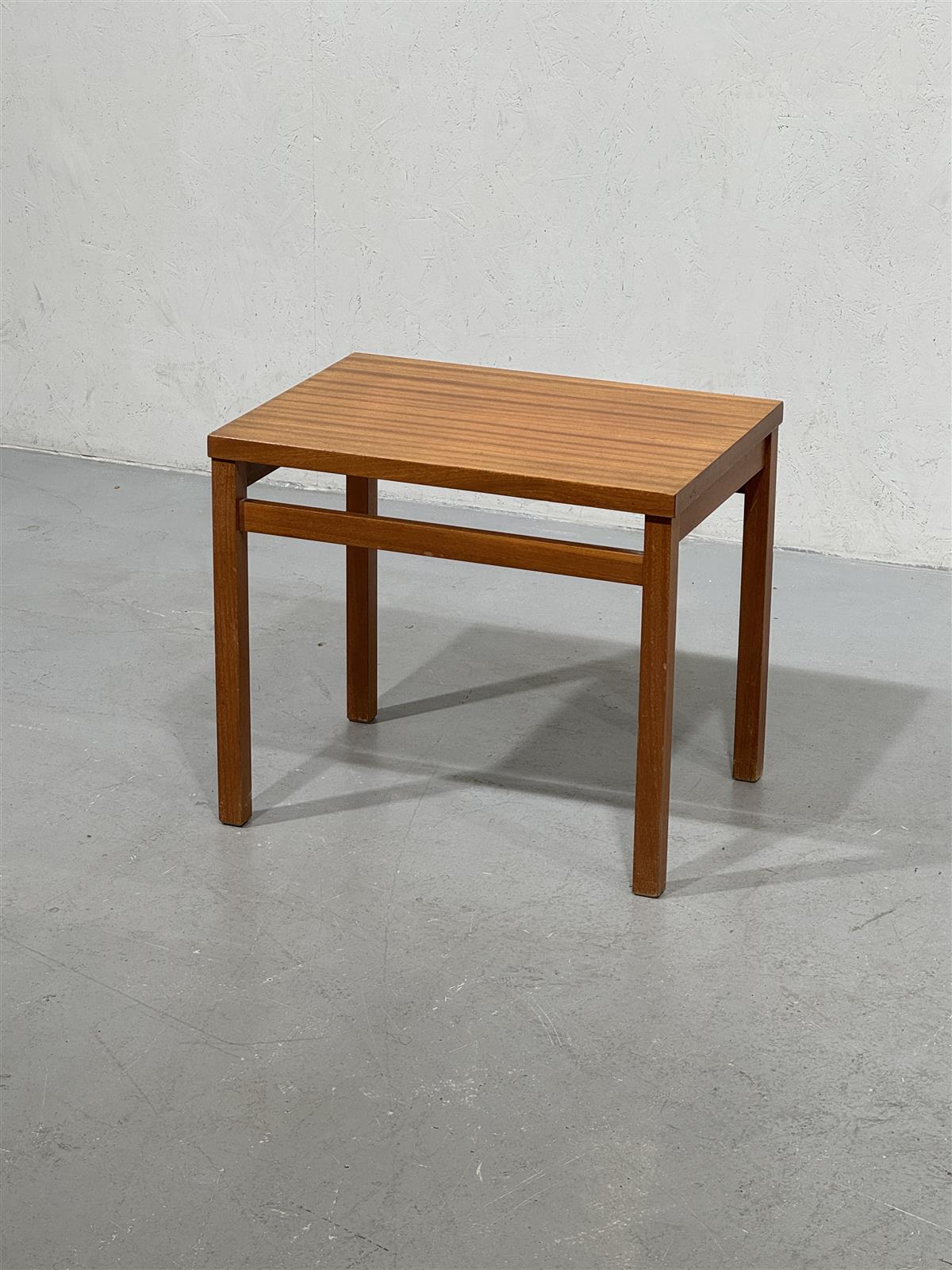 Kompakti ja yksinkertainen pieni sivupöytä tiikkiviilua, joka sopii monenlaisiin tiloihin. Pöydän suoraviivainen muotoilu tekee siitä monikäyttöisen ja helpon yhdistää muihin huonekaluihin. Valmistajaa ei tiedetä, mutta pöydän tyyli on ajaton ja käytännöllinen.