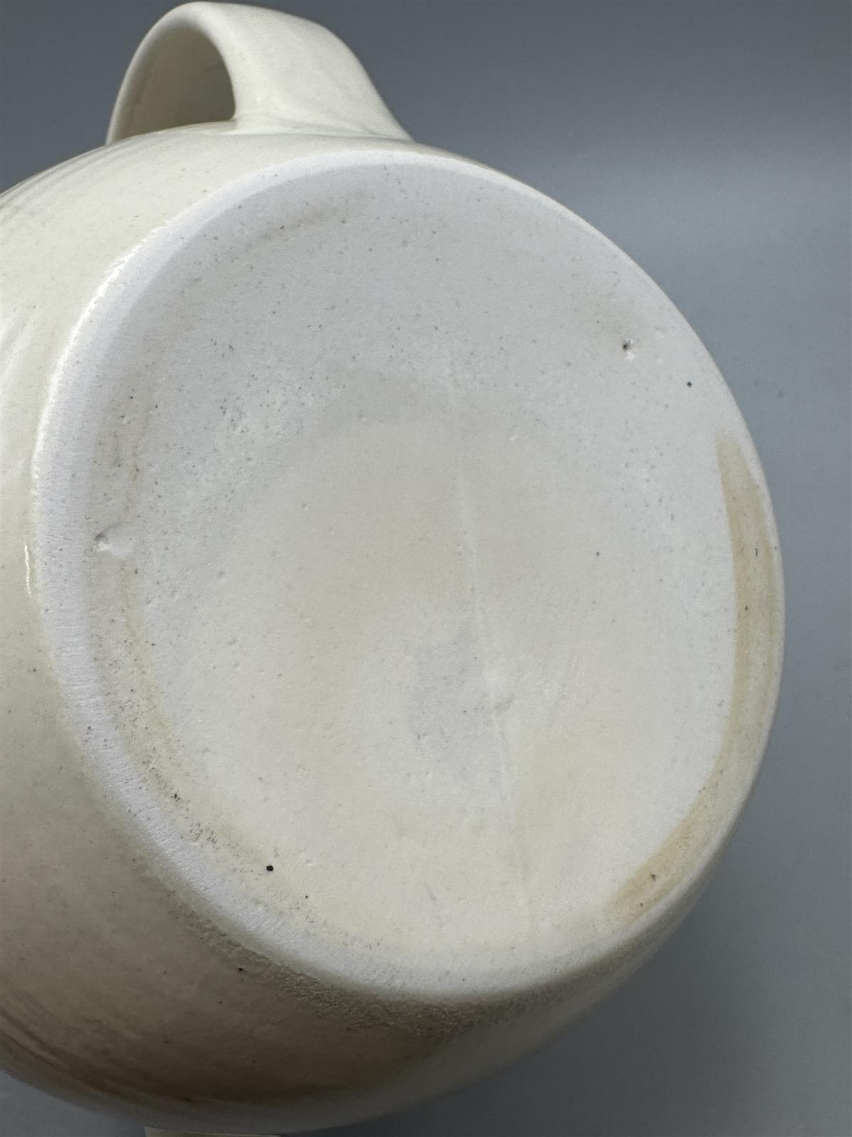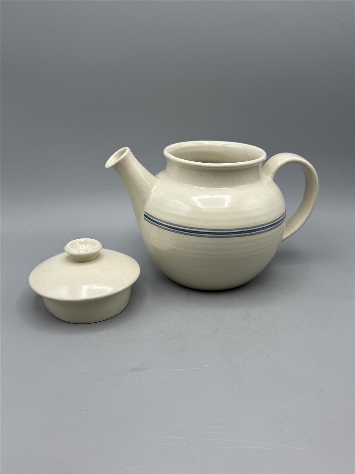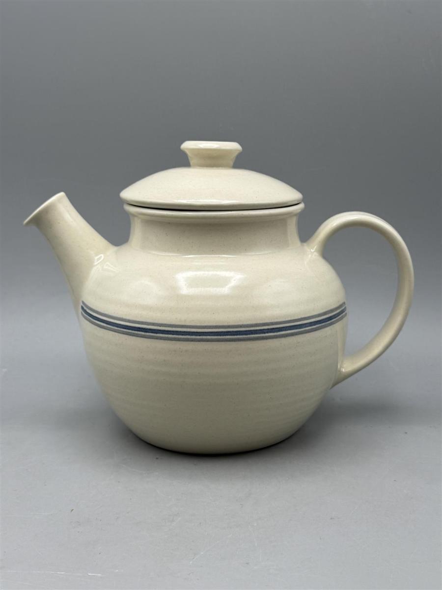 Vintage teekannu, jossa on yksinkertainen ja ajaton muotoilu. Kannussa on vaalea pohjaväri ja sininen raita, joka kiertää sen keskiosaa. Kansi on irrotettava ja siinä on pieni nuppi helpottamaan avaamista.