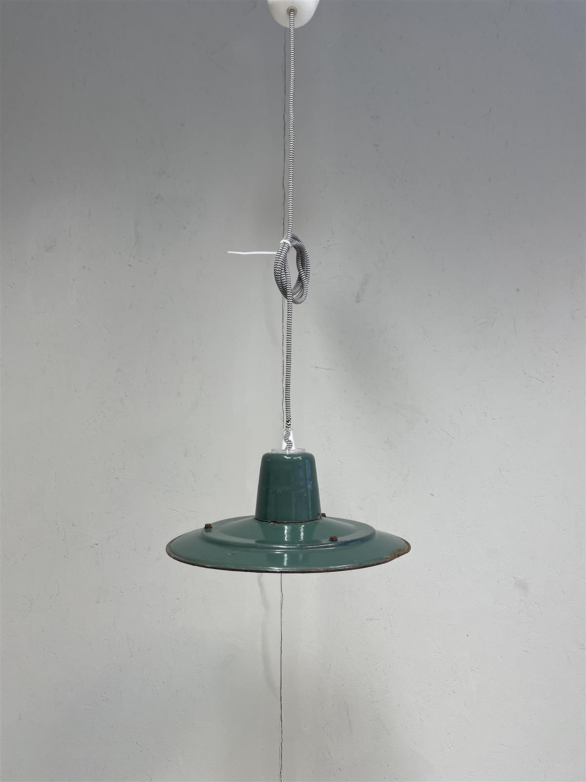 Vihreä vintage teollisuusvalaisin 60 luvulta, joka on valmistettu emaloidusta metallista. Valmistaja oletettavasti Polam Wilkasy Puola. Valaisimessa on yksinkertainen ja toimiva muotoilu, joka sopii hyvin teolliseen tyyliin. Valaisimen varjostin on leveä ja matala, mikä antaa laajan valokeilan.