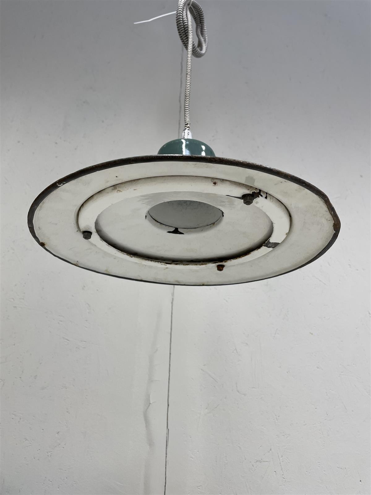 Valaisimessa on näkyvää kulumaa ja ruostetta erityisesti reunoilla, mikä korostaa sen vintage-ilmettä. Johto ja kattokuppi ovat uusittu.