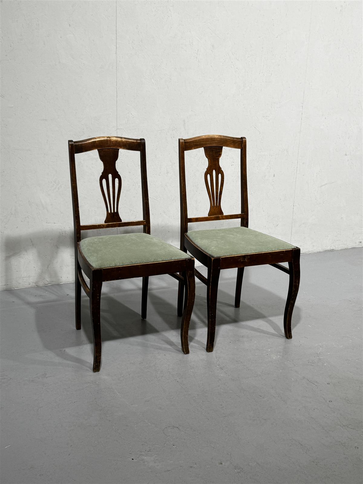 Kaksi vintage tuolia, joissa on koristeelliset selkänojat ja vihreät istuimet. Tuolit ovat tummanruskeat ja niissä on kaarevat jalat.