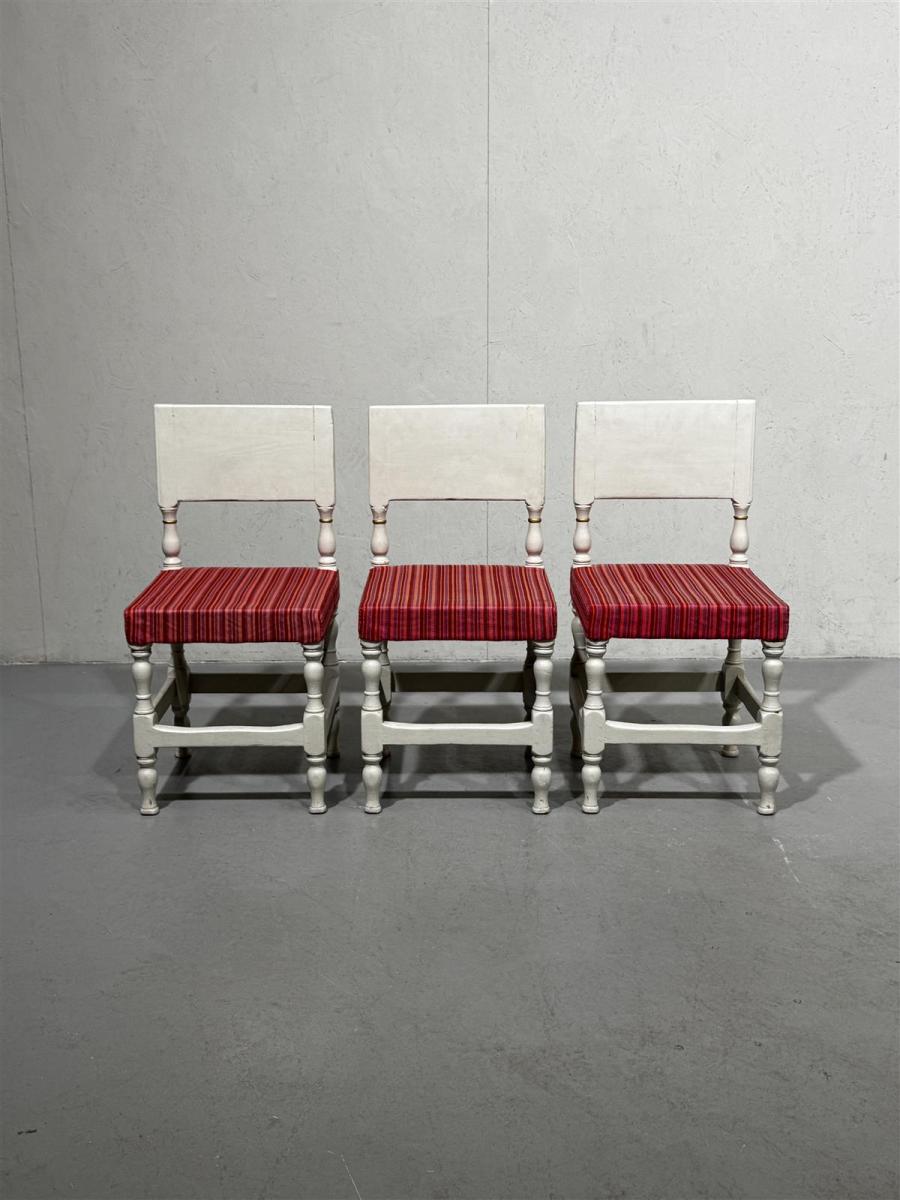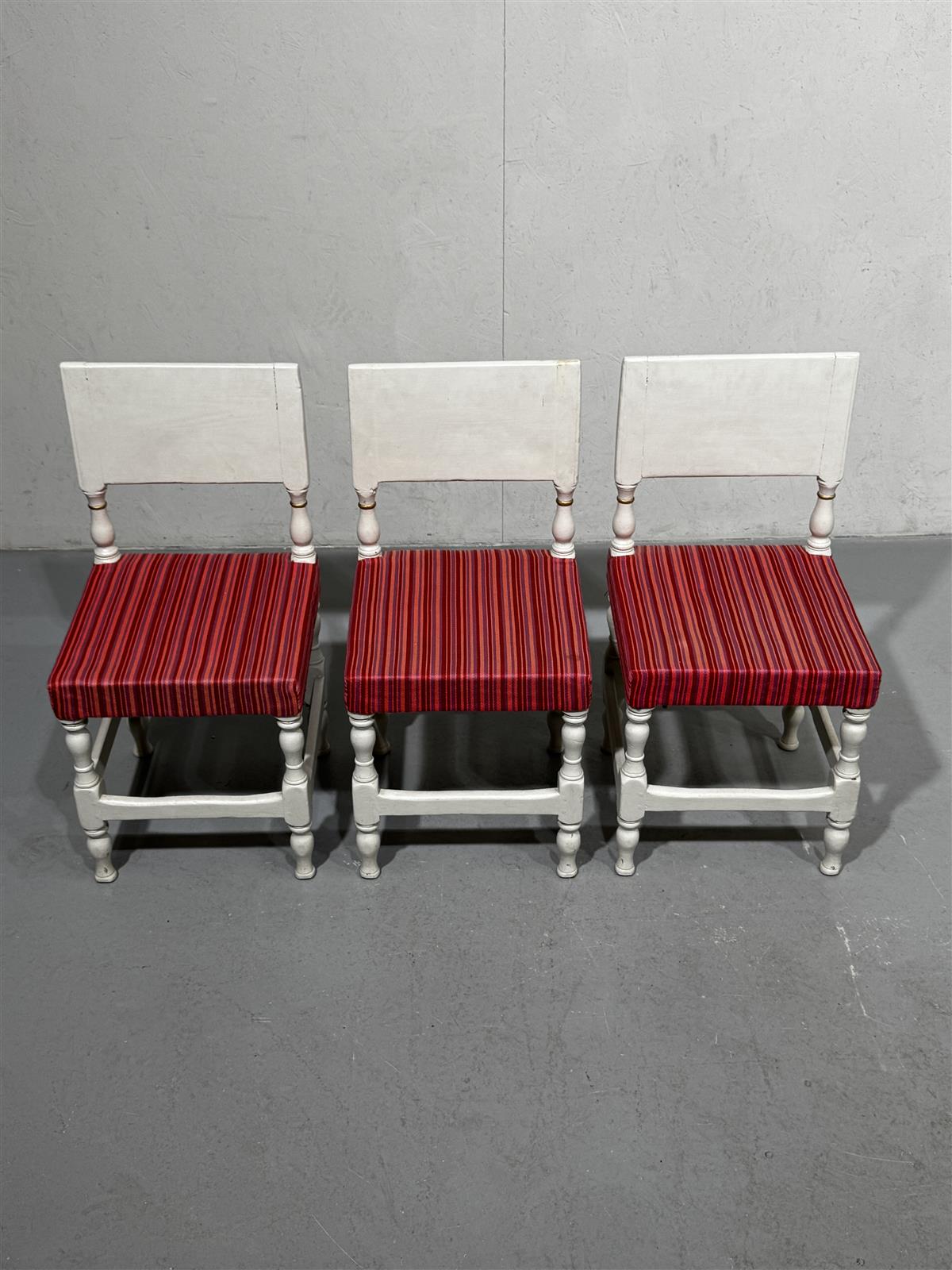 Kolme valkoista pientä tuolia, joissa on punaraidalliset istuimet. Tuolien selkänojat ovat yksinkertaiset ja jalat ovat koristeellisesti muotoillut.