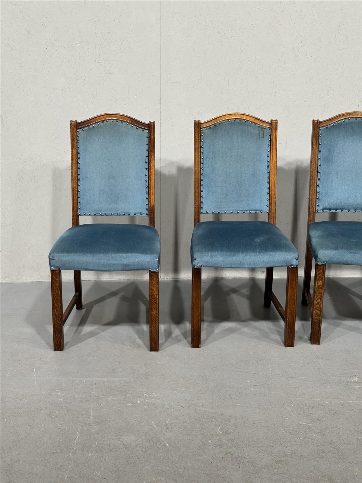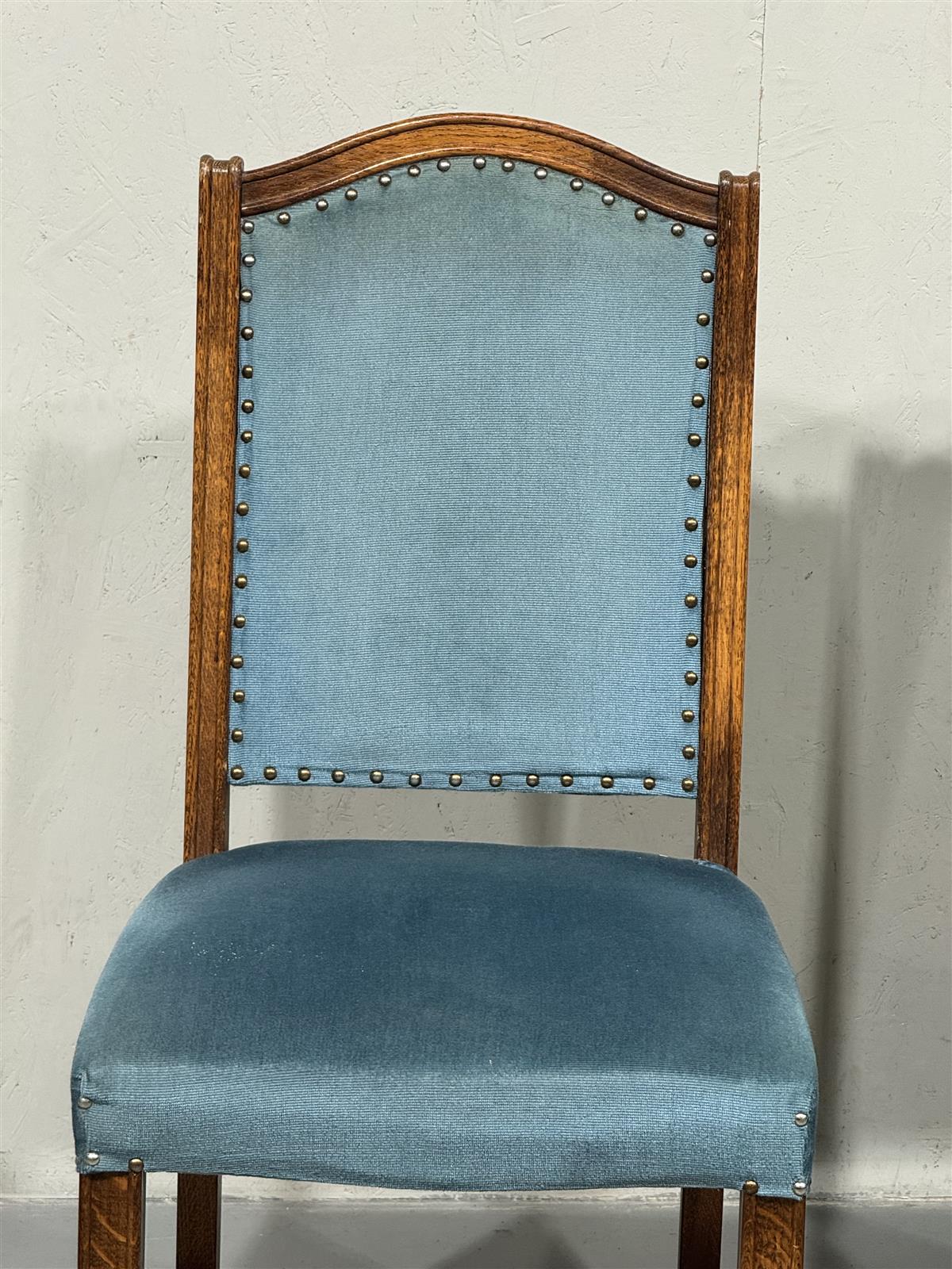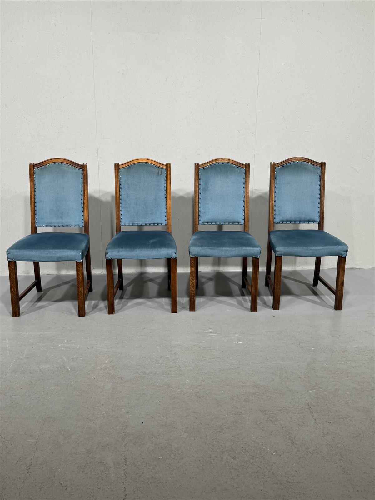 Neljä vintage-tyylistä tuolia, joissa on sininen verhoilu ja koristeelliset niitit. Tuolien runko on tummanruskea.