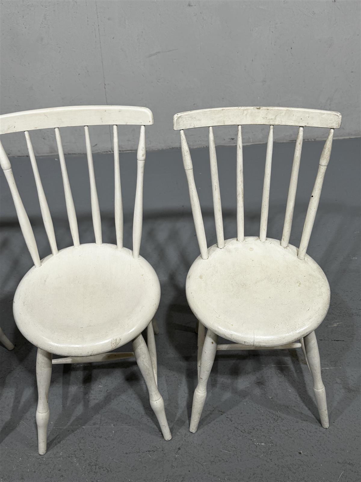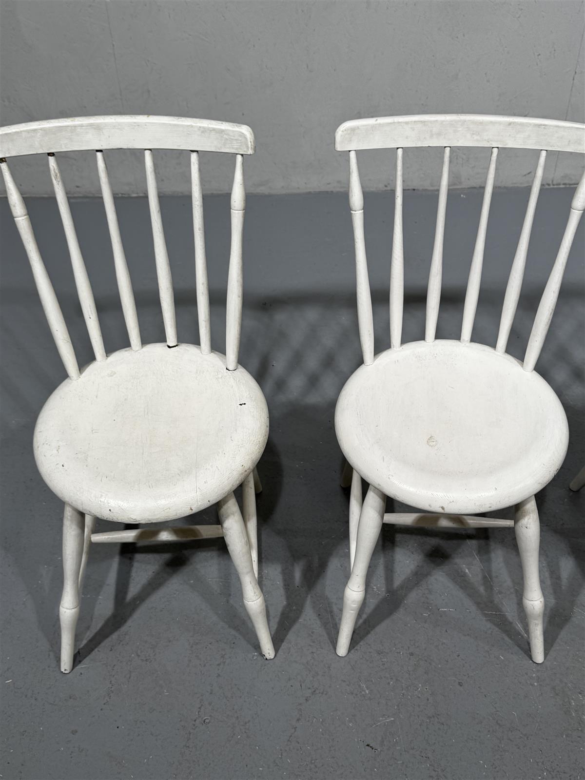 Neljä valkoista puutuolia, joissa on selkeä talonpoikaistyyli. Tuolit ovat yksinkertaisia ja toimivia, sopien monenlaisiin sisustuksiin. Selkänojat ovat kapeat ja istuimet pyöreät, mikä antaa niille perinteisen ilmeen. Kaksi tuoleista hieman vanhempaa tuotantoa ja kaksi hieman uudempaa, kaikki kuitenkin vaikuttavat käsityönä tehdyiltä, valkoisiksi maalatuilta.