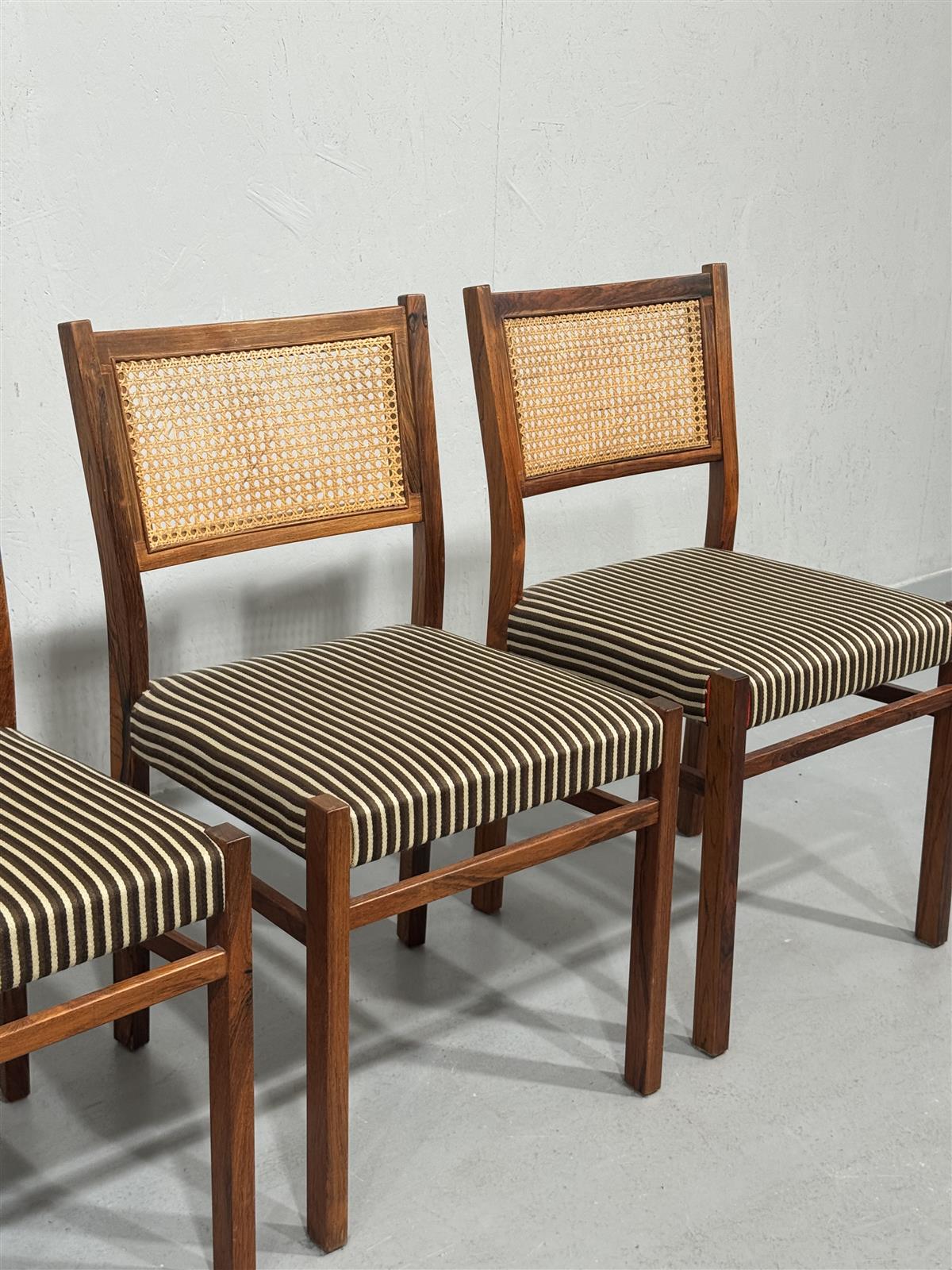 Tyylikkäät vintage tuolit, joissa on rottinkiselkänoja ja raidallinen kangasistuin ja ikäisekseen erittäin hyväkuntoinen tiikkipuu runko. Näitä tuoleja on neljä kappaletta, ja ne tuovat tilaan ajattoman ilmeen. Rottinkiselkänoja antaa tuoleille kevyen ja ilmavan ulkonäön, kun taas raidallinen kangasistuin lisää kontrastia ja mukavuutta.