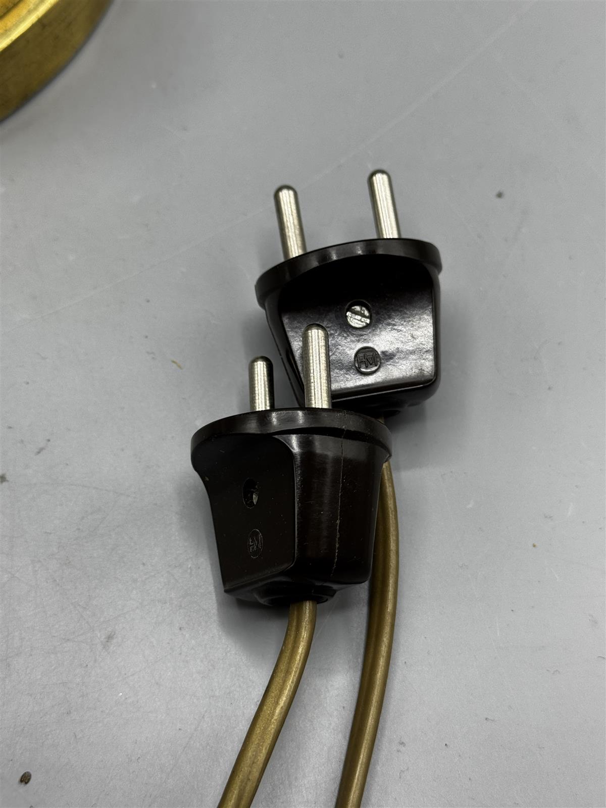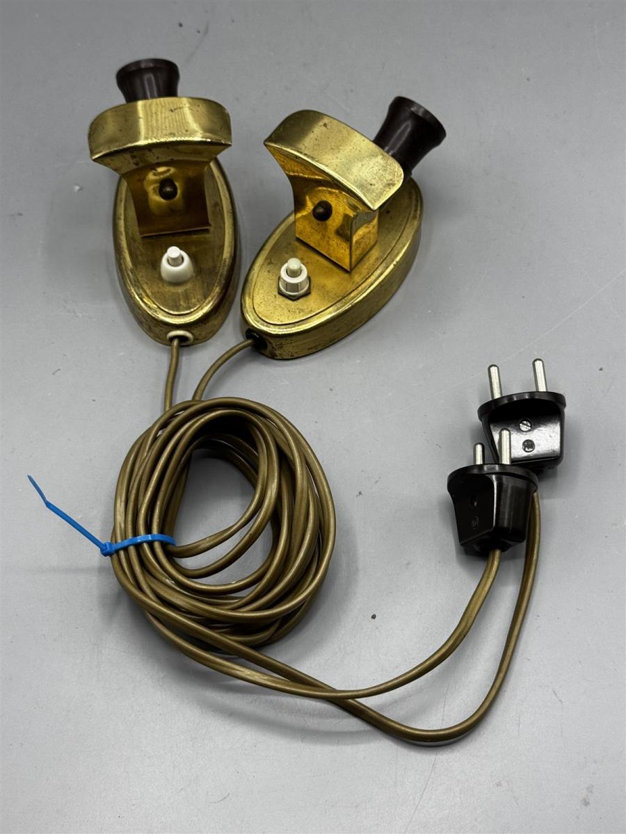 Kaksi vintage-seinävalaisinta, joissa on messinkinen runko ja tummat yksityiskohdat. Valmistaja Valinte, takana merkki. Valaisimista oletettavasti puuttuu eteen asetettava varjostin/suoja, huomioitu hinnassa. Valaisimissa on pyöreä kytkin ja pitkä johto, joka päättyy kaksinapaisiin pistokkeisiin.