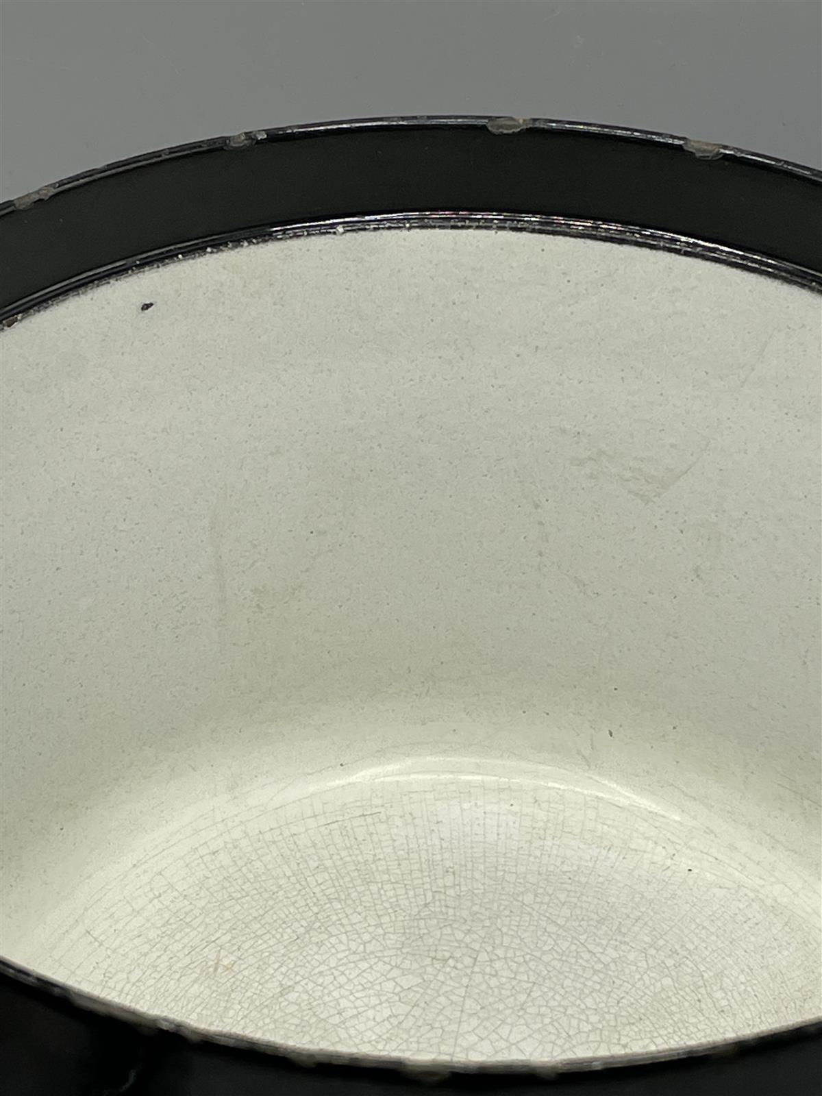 Padassa on näkyvissä kulumisen merkkejä, kuten pieniä naarmuja ja emalipinnan kulumia. Puinen kahva on hieman kulunut, mutta edelleen tukeva. Sisäpinnassa on joitakin käytön jälkiä, krakelointia.