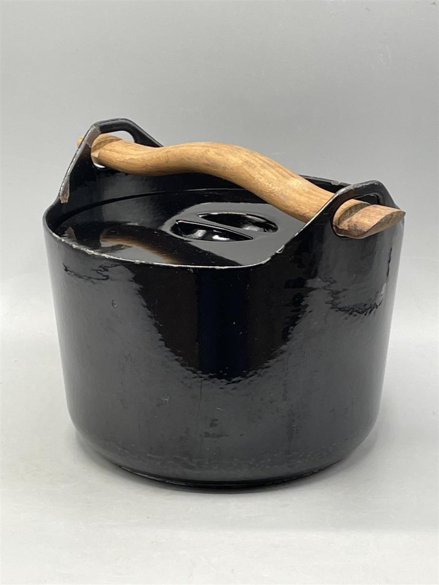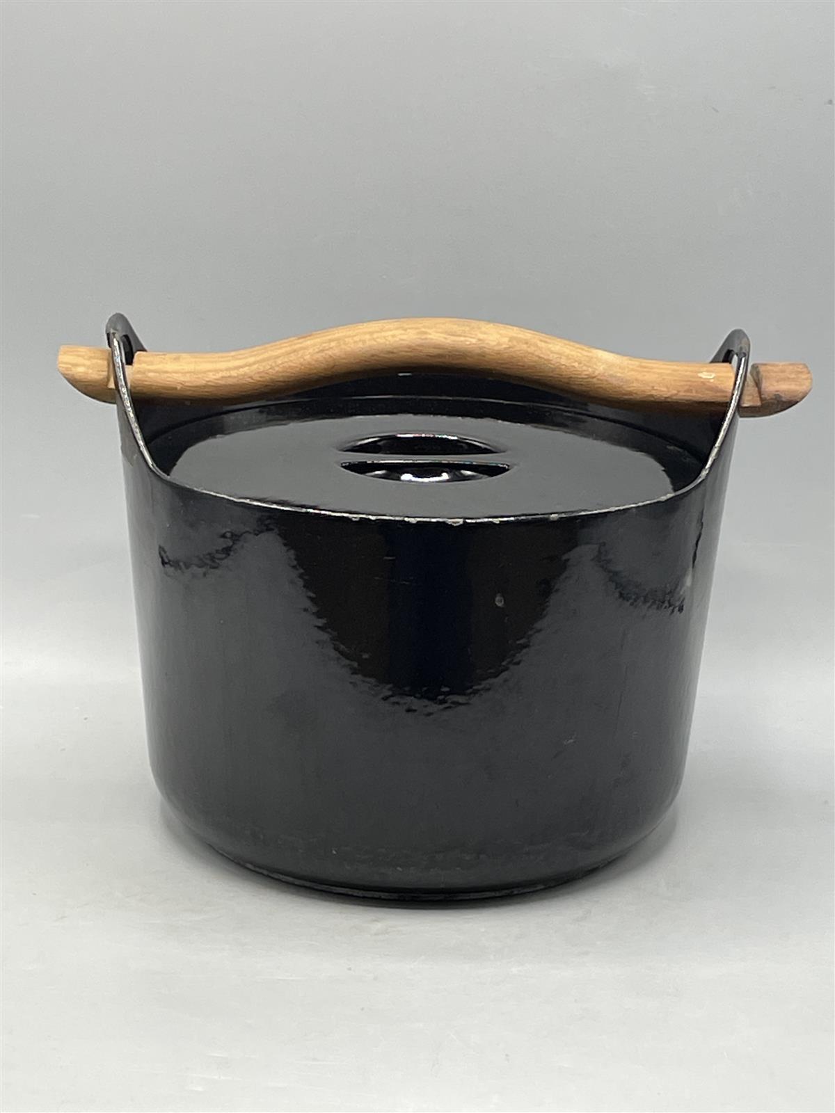 Vintage-valurautapata, jossa on musta emalipinta ja puinen kahva design Timo Sarpaneva. Pata on suunniteltu kestämään kovaa käyttöä ja se sopii monenlaiseen ruoanlaittoon. Sen klassinen muotoilu tekee siitä ajattoman lisän keittiöön. Tilavuus 3 ltr.
