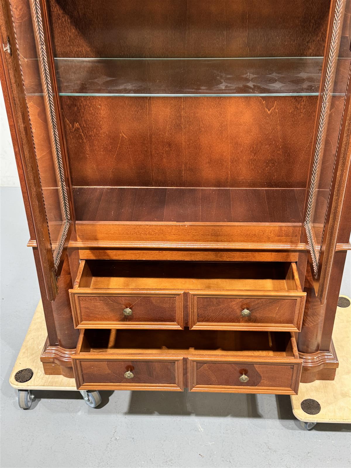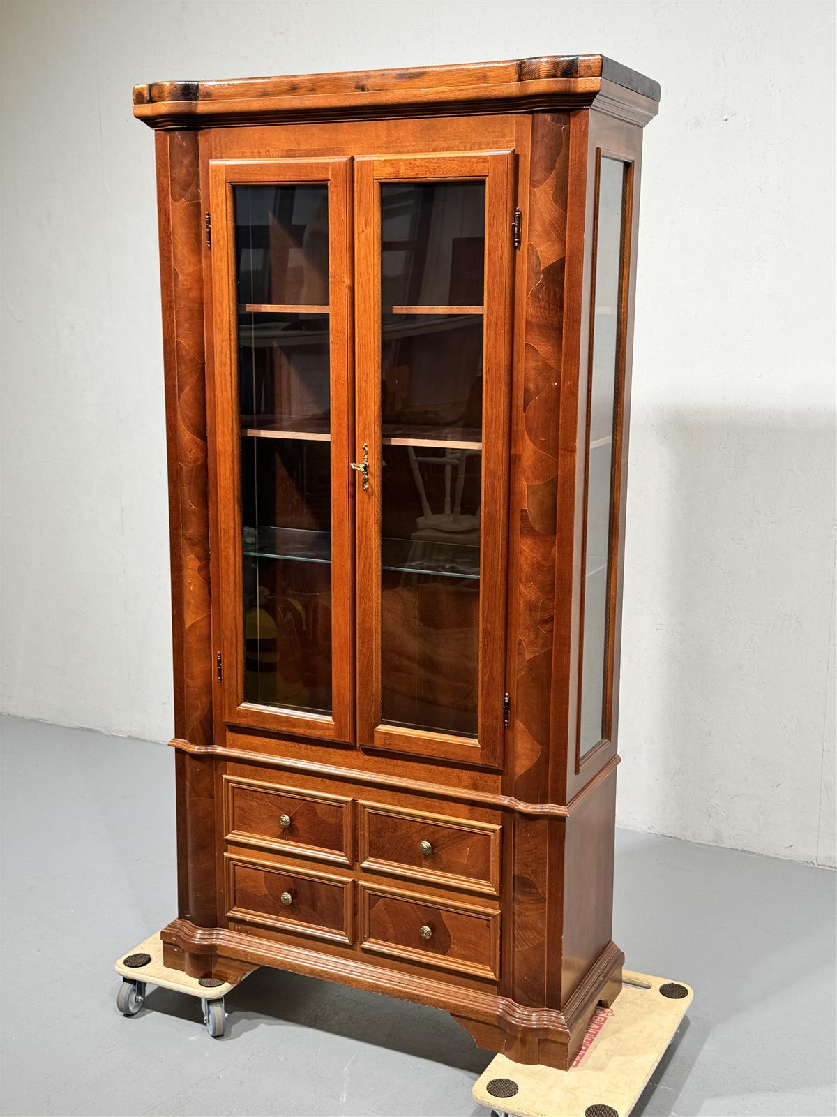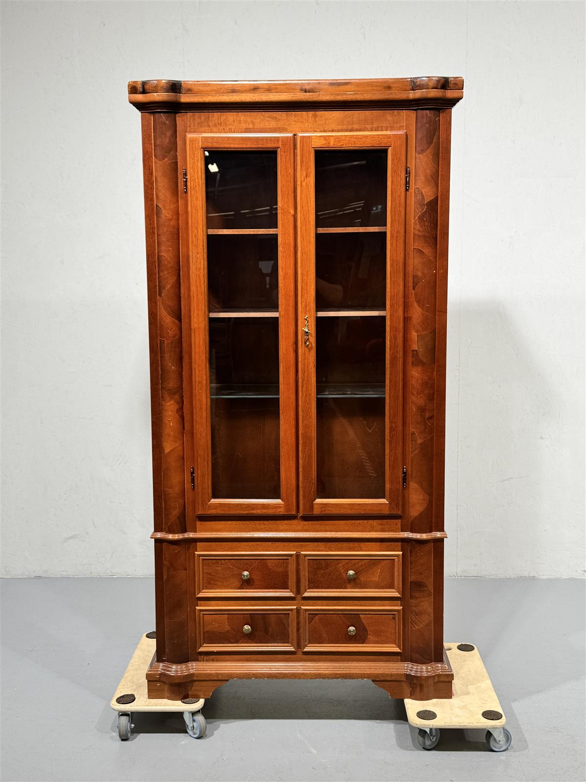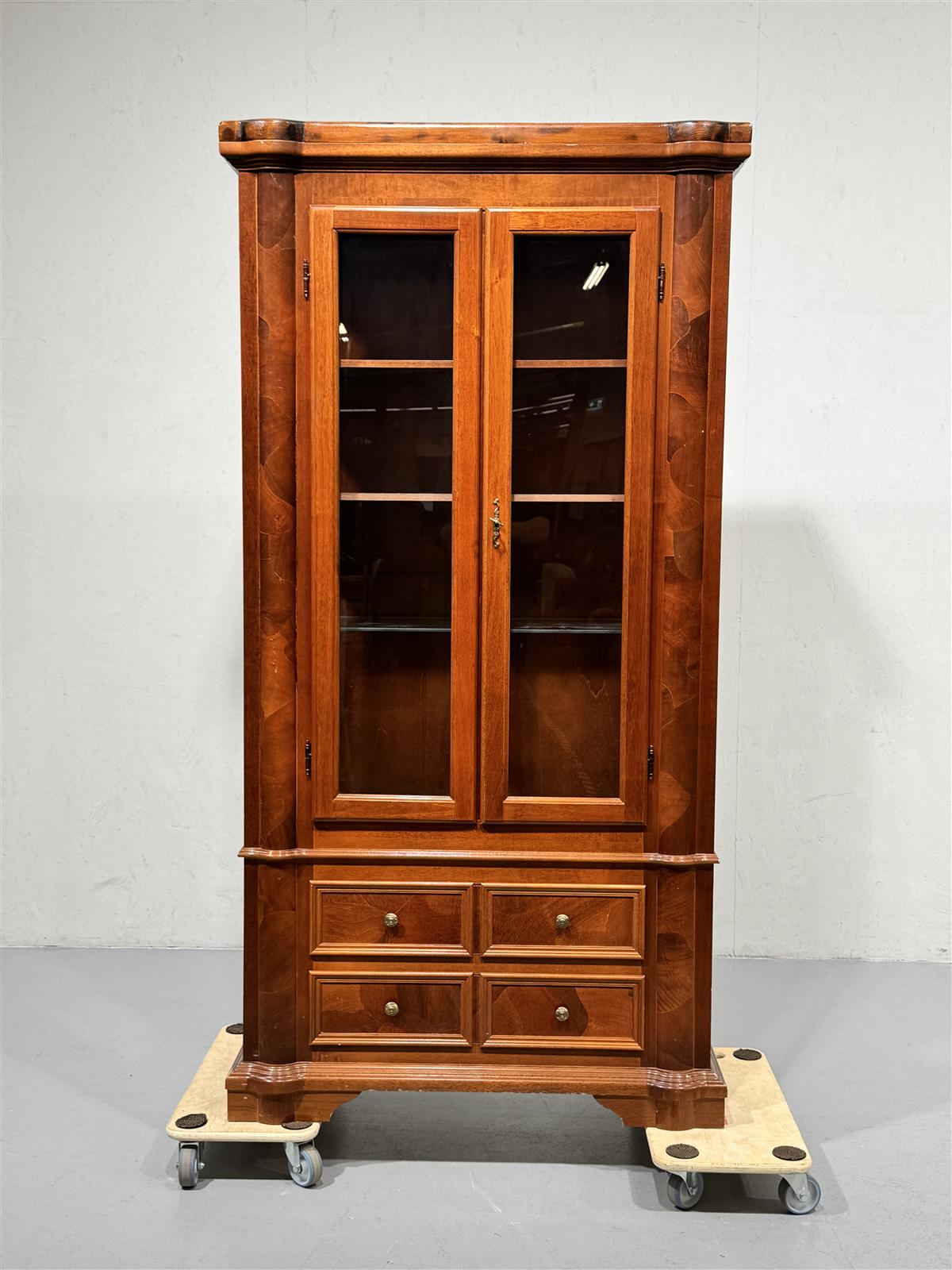 Talonpoikaistyyliä edustava astiakaappi, jossa on lasiovet ja kaksi vetolaatikkoa. Kaapin sisällä on hyllyjä, jotka tarjoavat runsaasti säilytystilaa astioille tai muille esineille. Mukana 2 puutasoa ja 3 lasitasoa, mutta vain 3 hyllylle pidikkeet. Kaapin puupinta on lämmin ja luonnollinen, mikä tuo tilaan kodikkuutta.