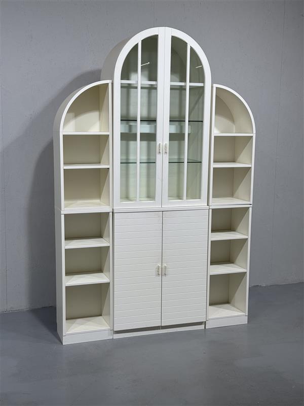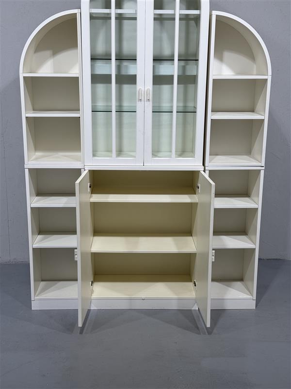 Sope Valkoinen vitriinikaappi lasiovilla ja useilla hyllyillä. Kaikki kuvissa näkyvät moduulit saa nätisti nostettua irti toisistaan.