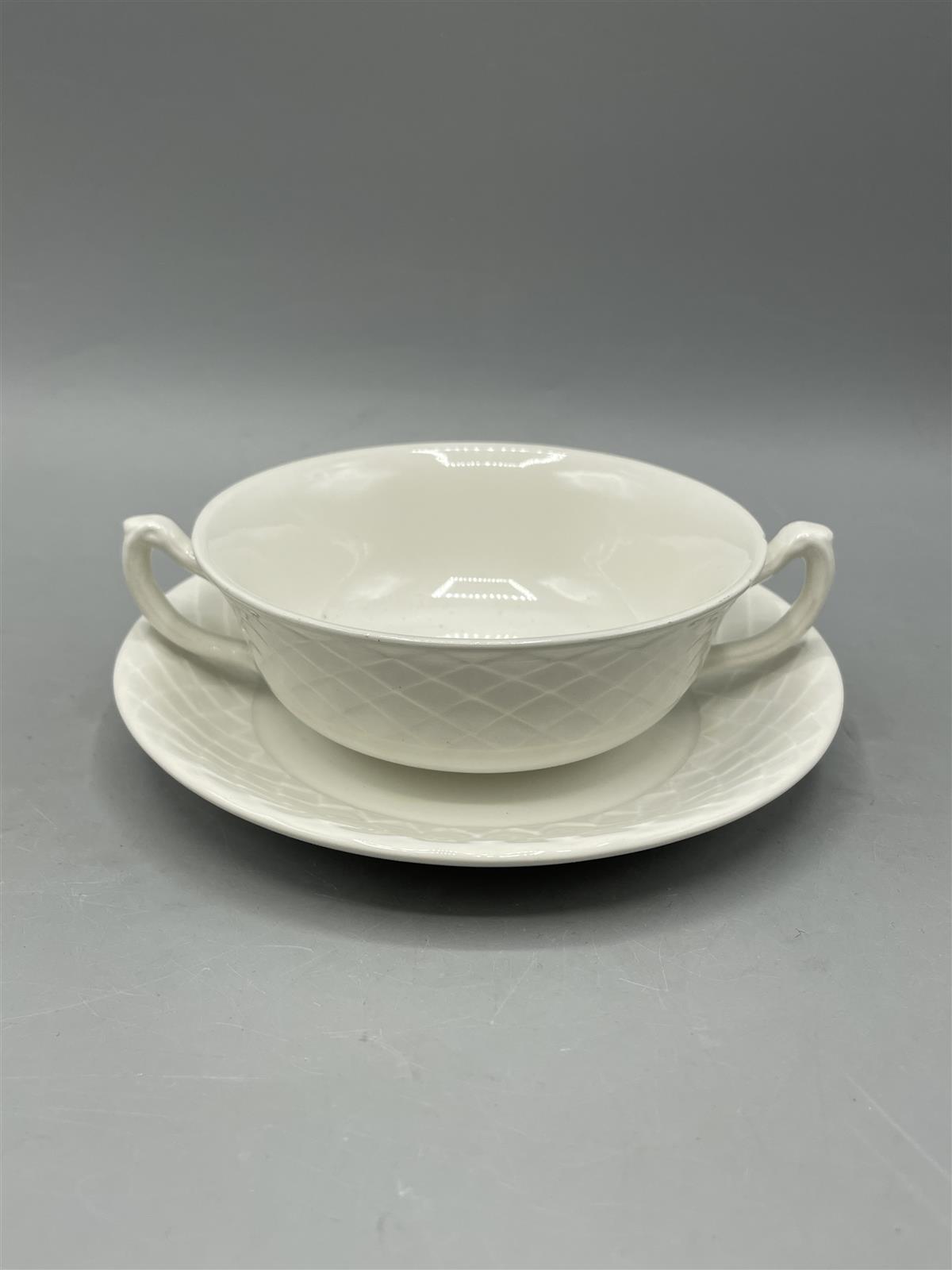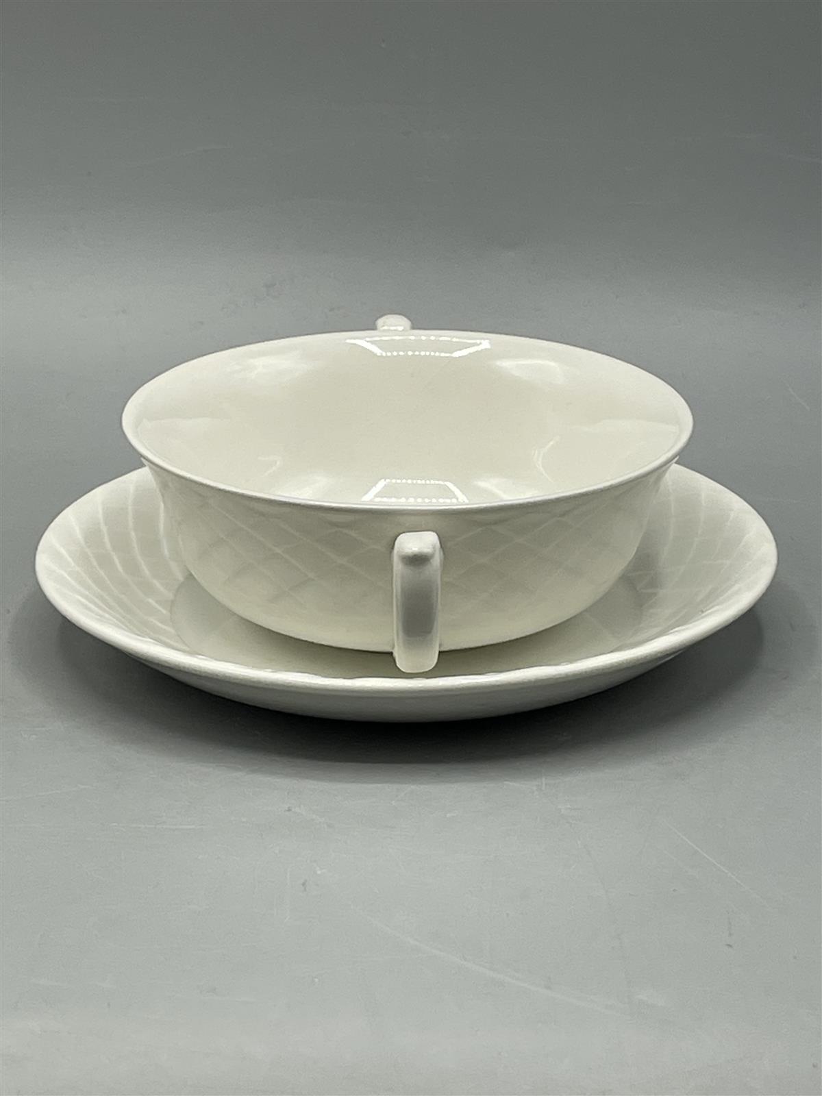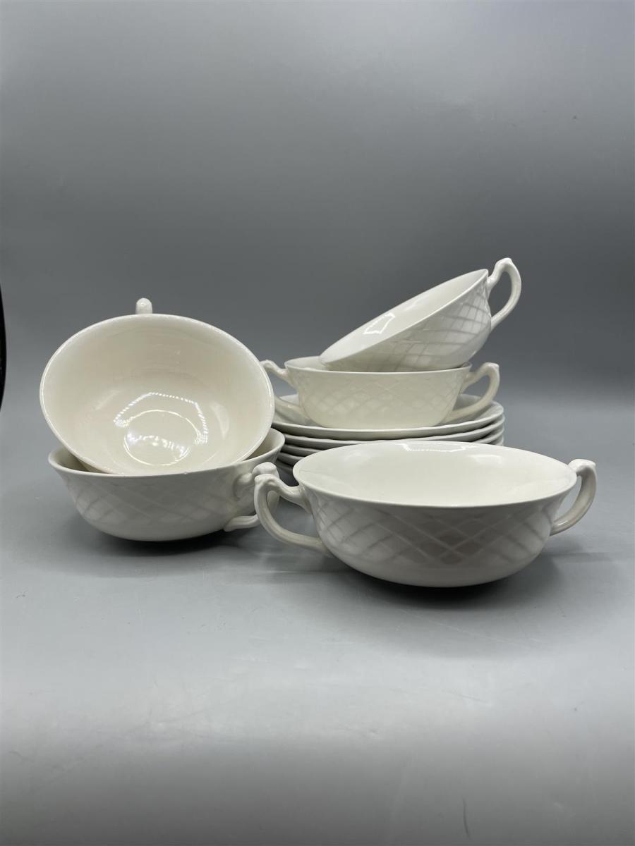 Viisi valkoista posliini keitto/liemikulhoa, joissa on kahvat ja kuvioitu pinta. Valmistaja on Wedgwood England.