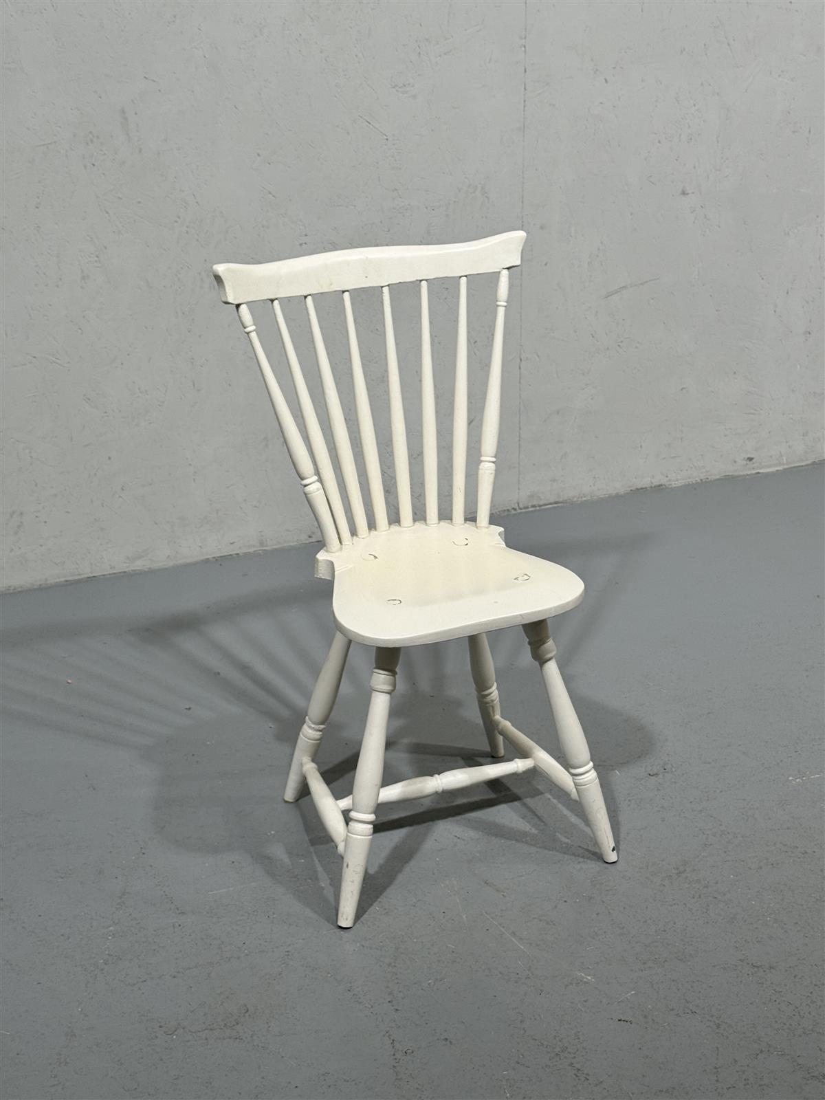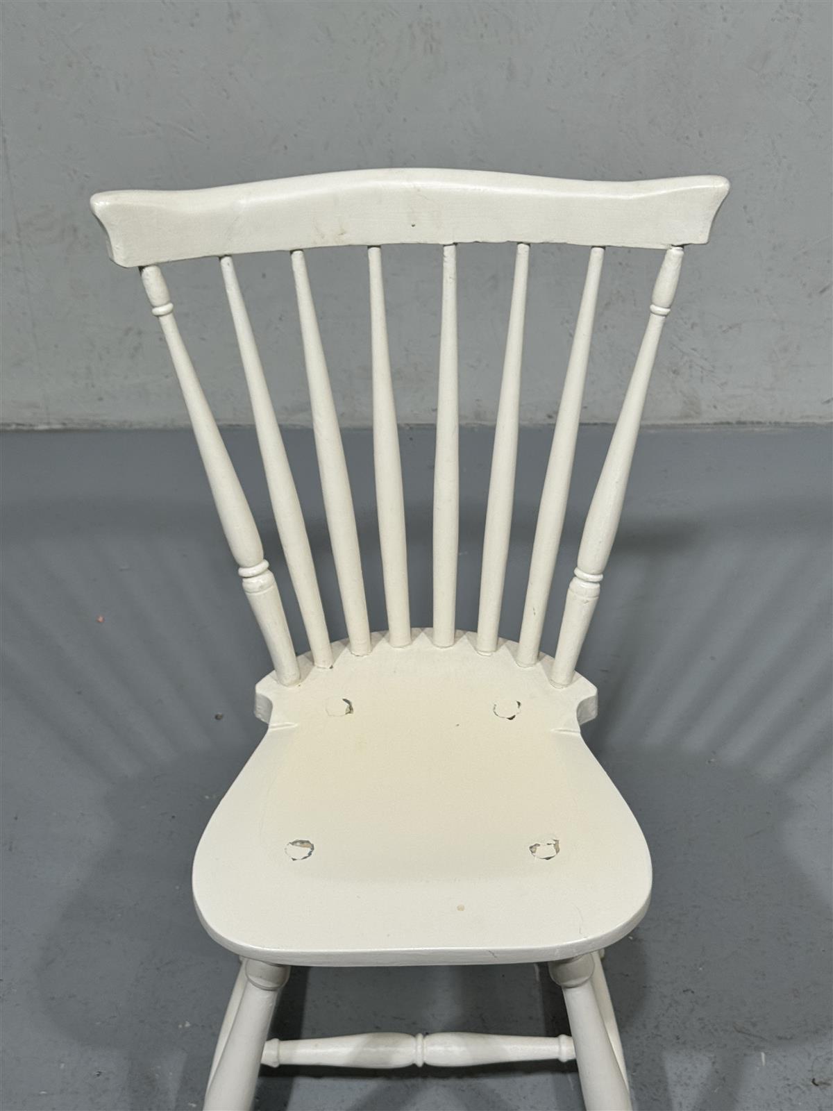 Antiikkinen Windsor tuoli, joka on valmistettu puusta ja maalattu valkoiseksi. Tuolissa on selkeä ja yksinkertainen muotoilu, joka on tyypillinen Windsor-tyylille. Leveä selkänoja, kapea istuinosa. Istuinkorkeus 41cm