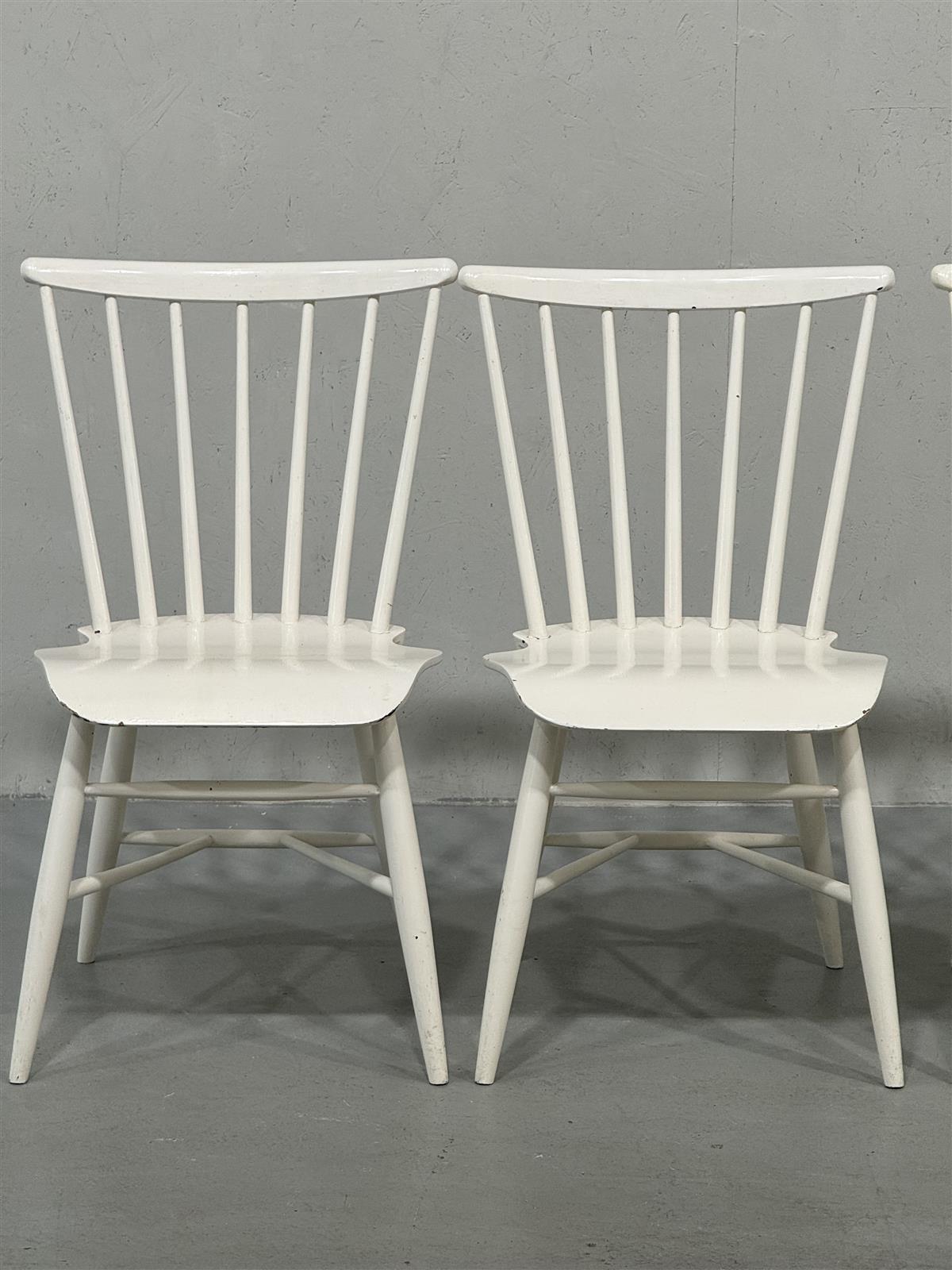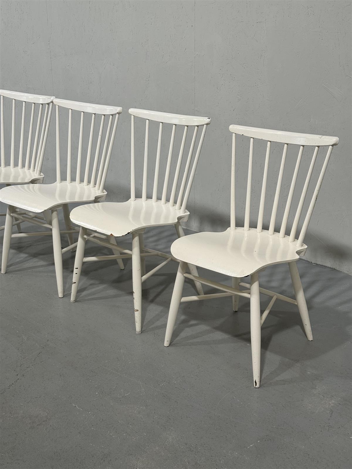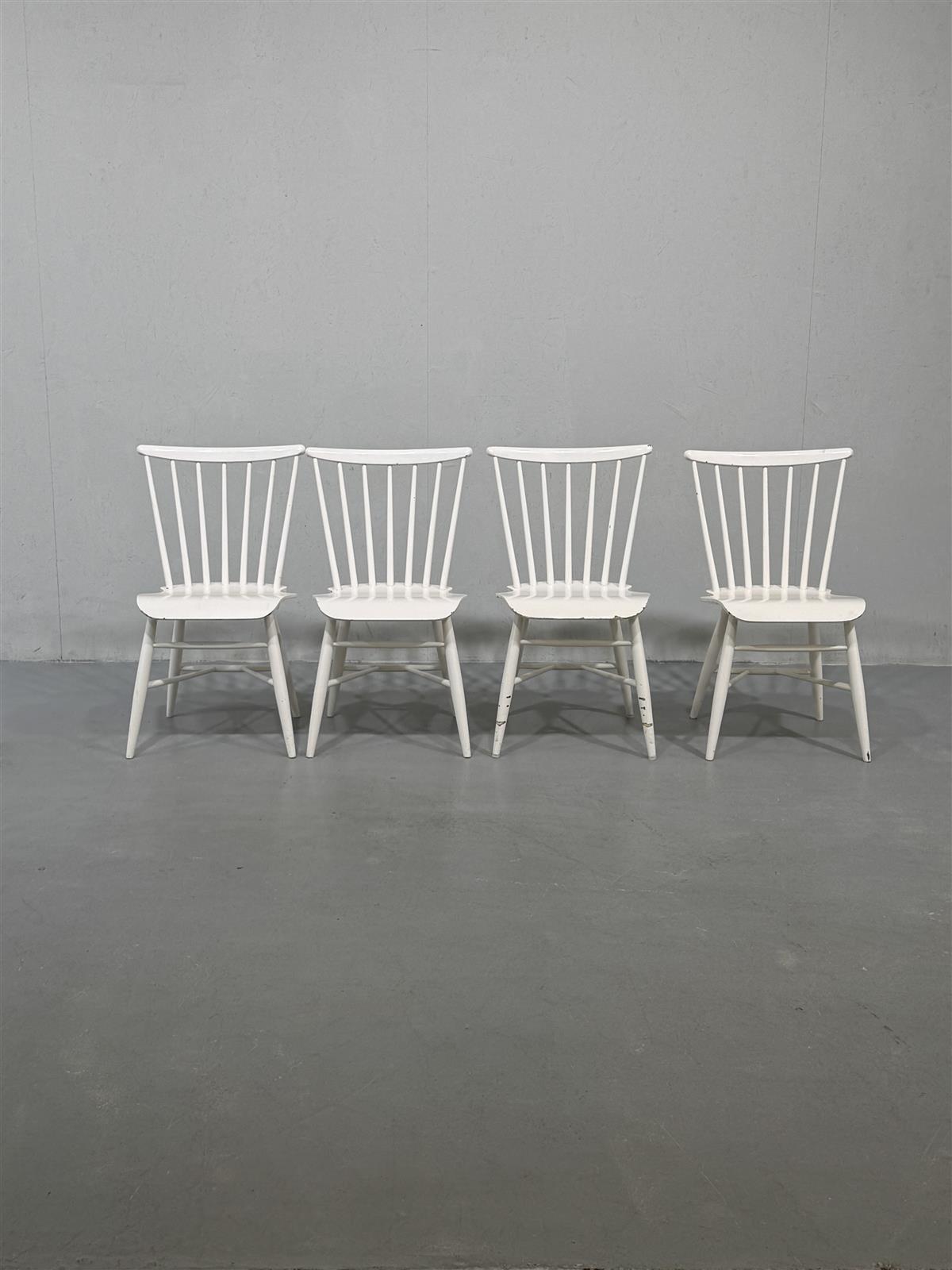 Neljä valkoista Windsor-tyylistä tuolia. Valmistettu puusta, maalattu valkoiseksi. Klassinen muotoilu, jossa selkänojan pinnat ja tukevat jalat. Sopii hyvin ruokapöydän ympärille tai erillisinä istuimina eri tiloihin.