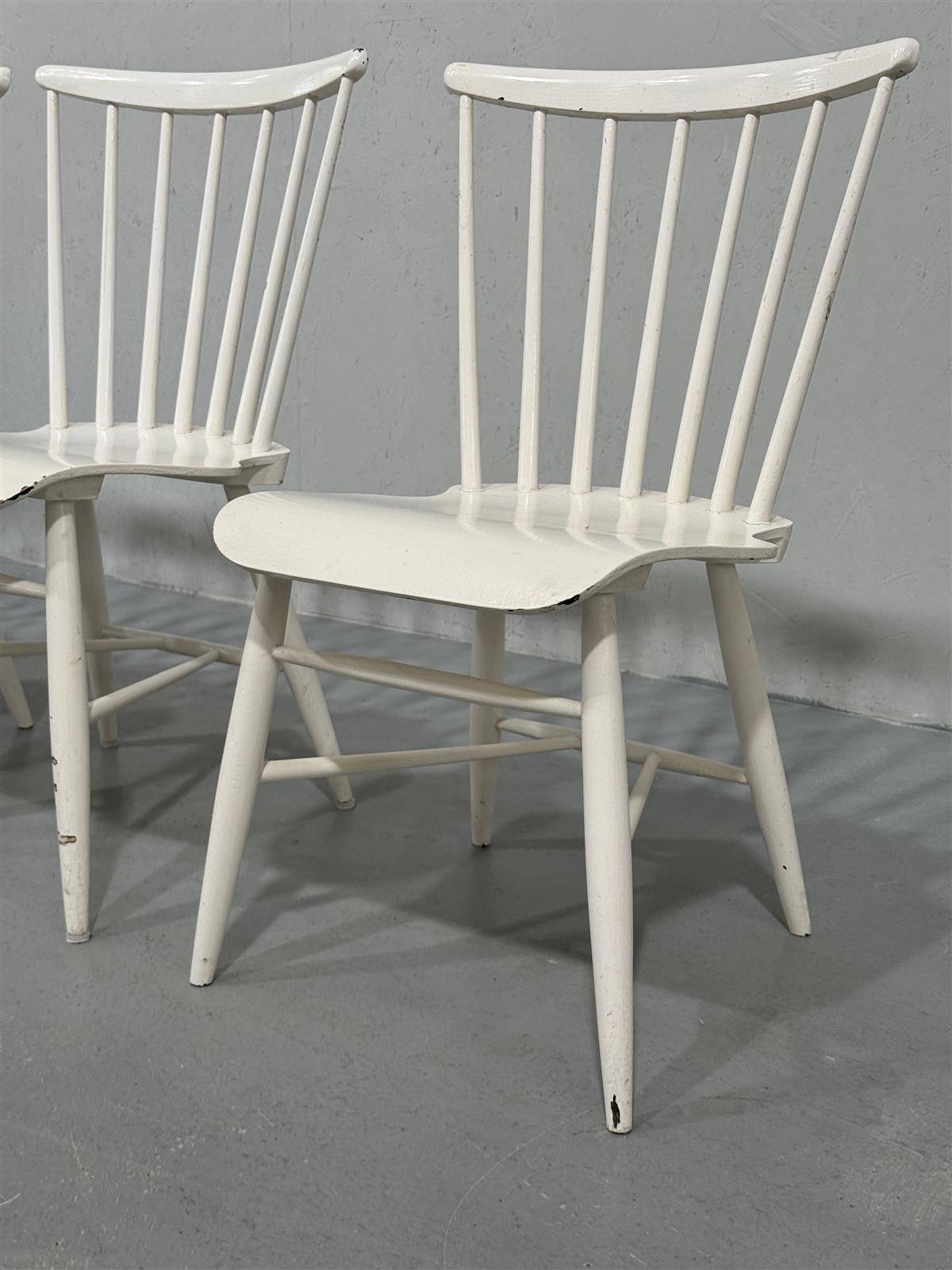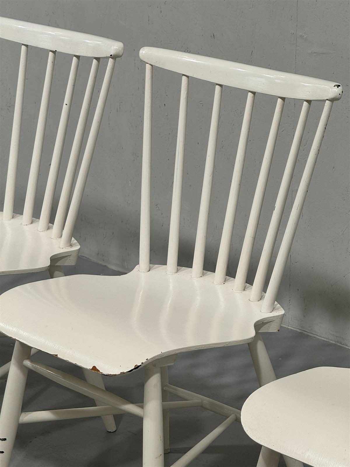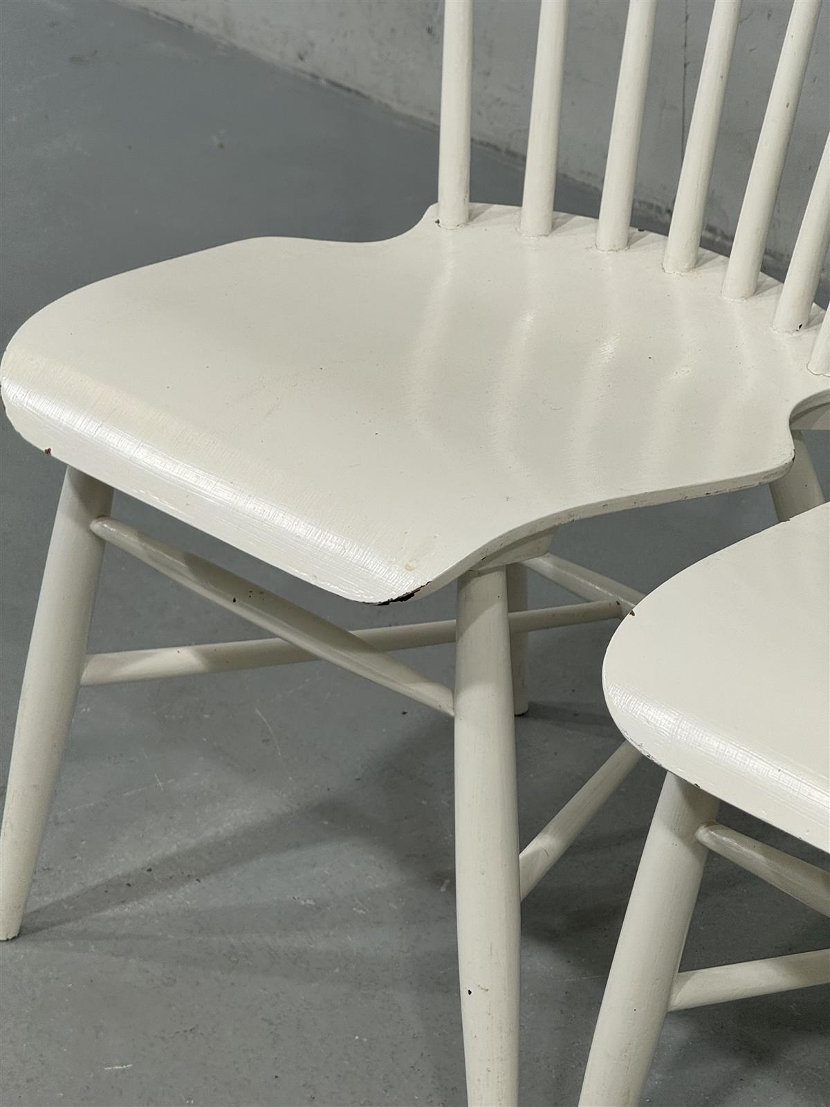 Neljä valkoista Windsor-tyylistä tuolia. Valmistettu puusta, maalattu valkoiseksi. Klassinen muotoilu, jossa selkänojan pinnat ja tukevat jalat. Sopii hyvin ruokapöydän ympärille tai erillisinä istuimina eri tiloihin.