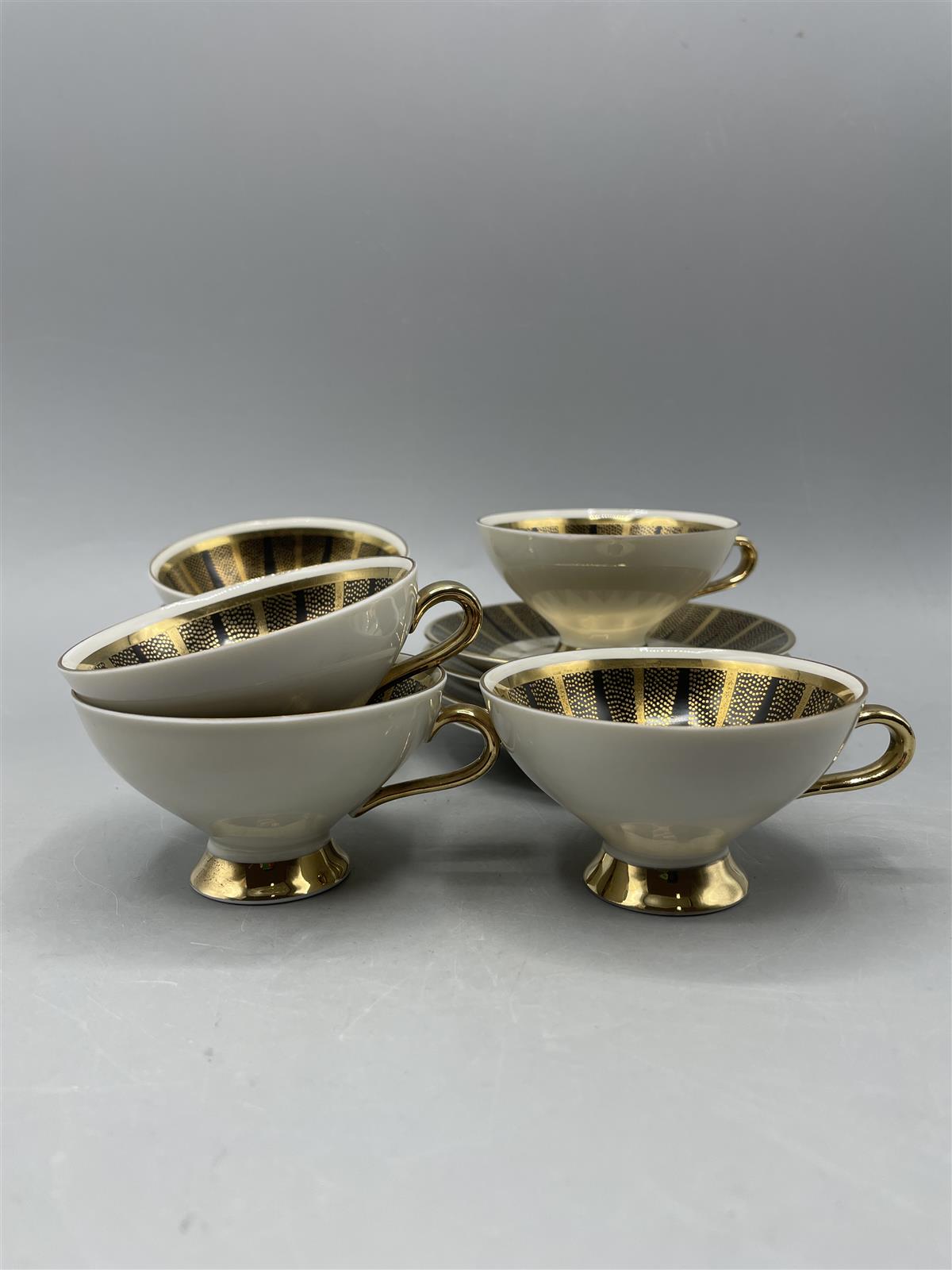 Tyylikkäät Winterling-mokkakupit, joissa on kultaiset yksityiskohdat ja koristeellinen kuviointi. Kupit ovat elegantisti muotoiltuja ja niissä on hienostunut jalkaosa.