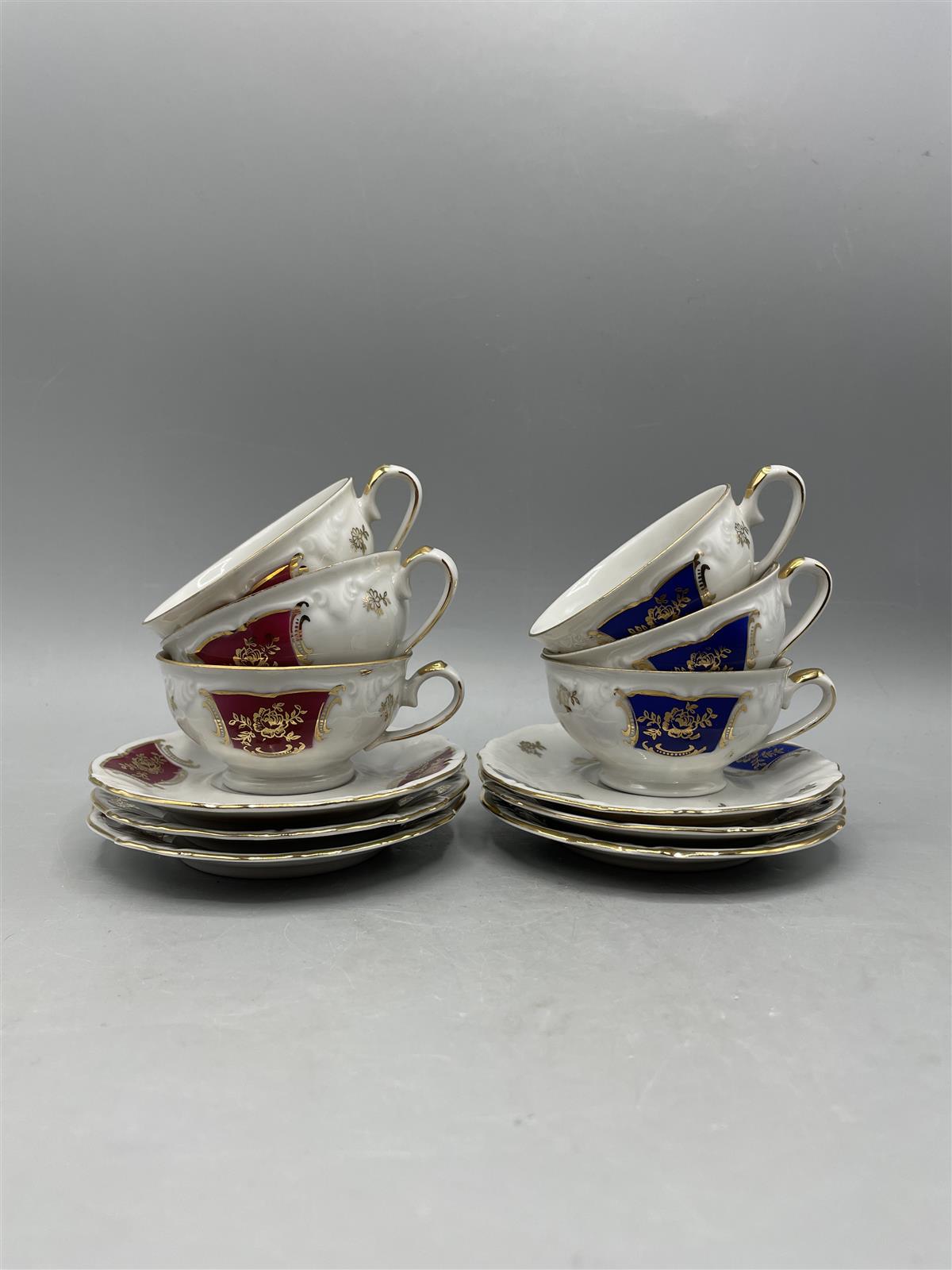 Winterling Bavaria mokka/kahvikupit 6kpl, joissa on kultaiset yksityiskohdat ja koristeelliset kuviot. Kupit ovat punaisia ja sinisiä, ja niissä on mukana lautaset.