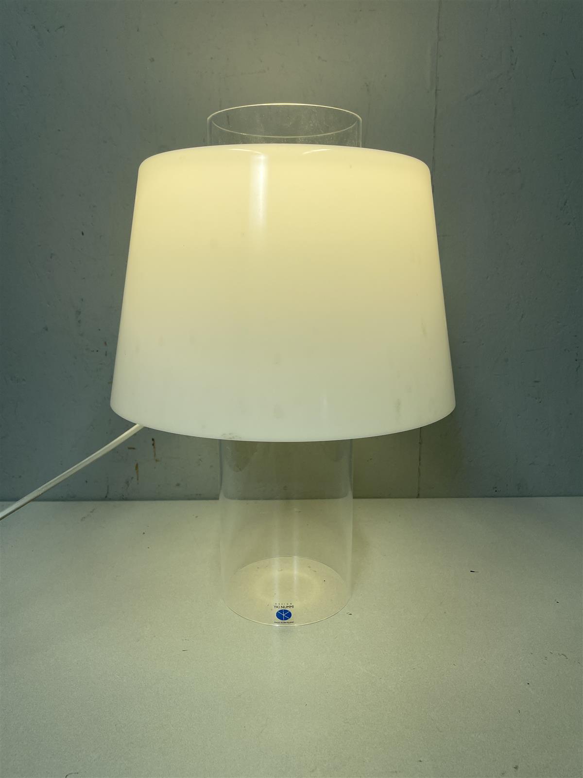 Tyylikäs Yki Nummi ”Modern art” pöytävalaisin, jossa on valkoinen akryylivarjostin ja kirkas jalka. Valaisimen on suunnitellut Yki Nummi, ja se on valmistettu Suomessa.