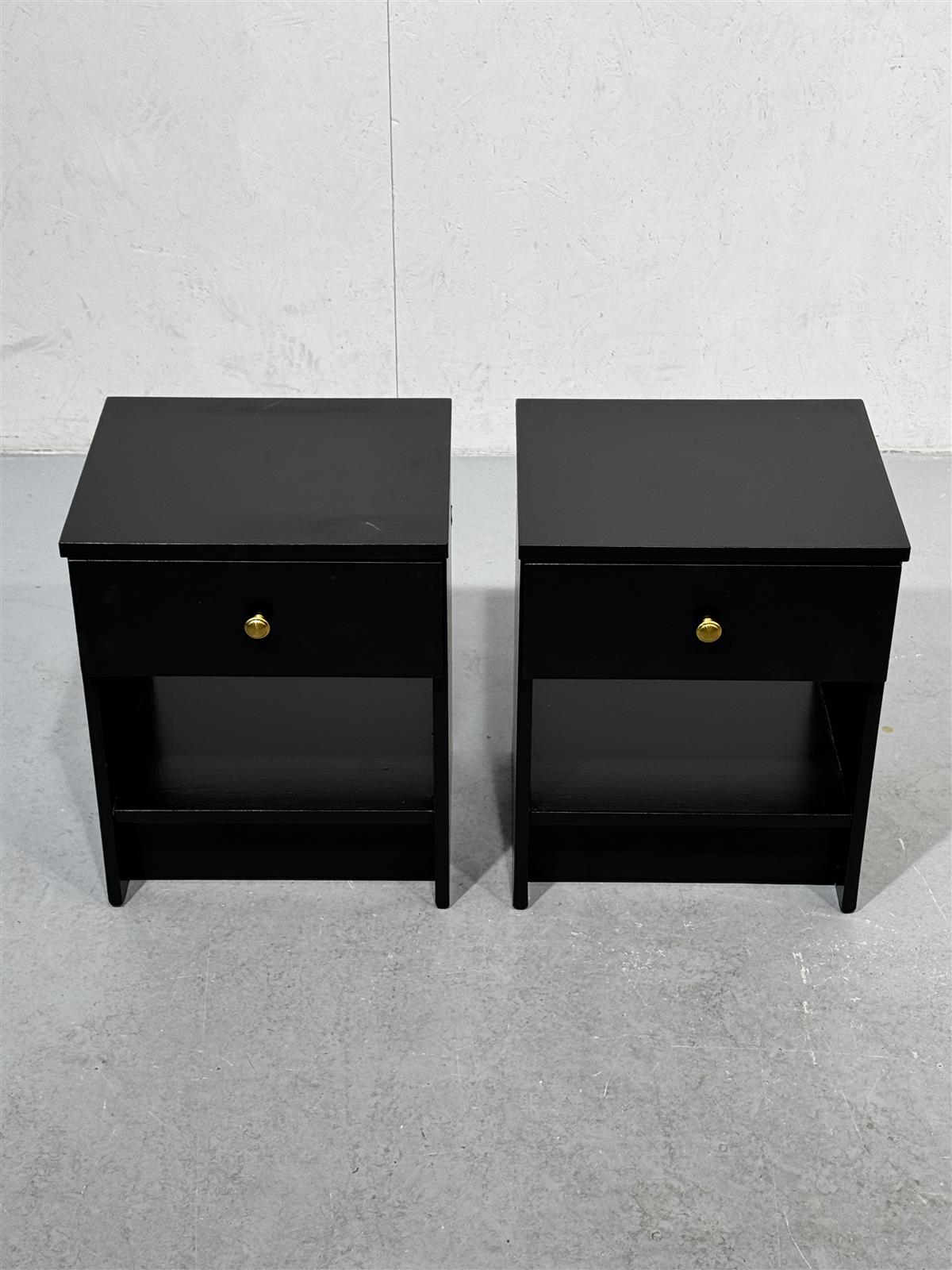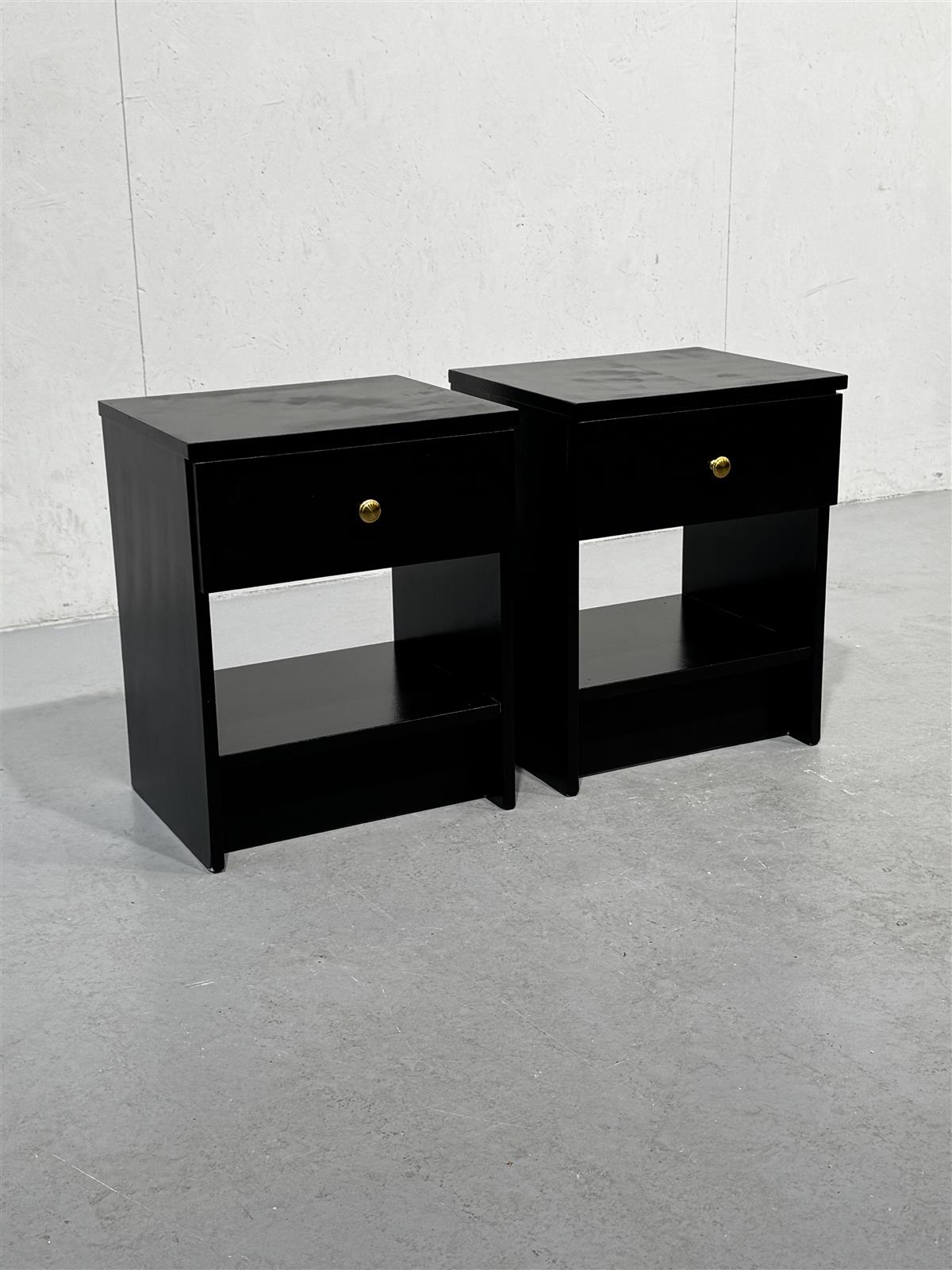 Kaksi mustaksi maalattua puista yöpöytää, joissa on yksi vetolaatikko kultaisella vetimellä ja avohylly. Vetimet ovat metallisia ja pyöreitä.