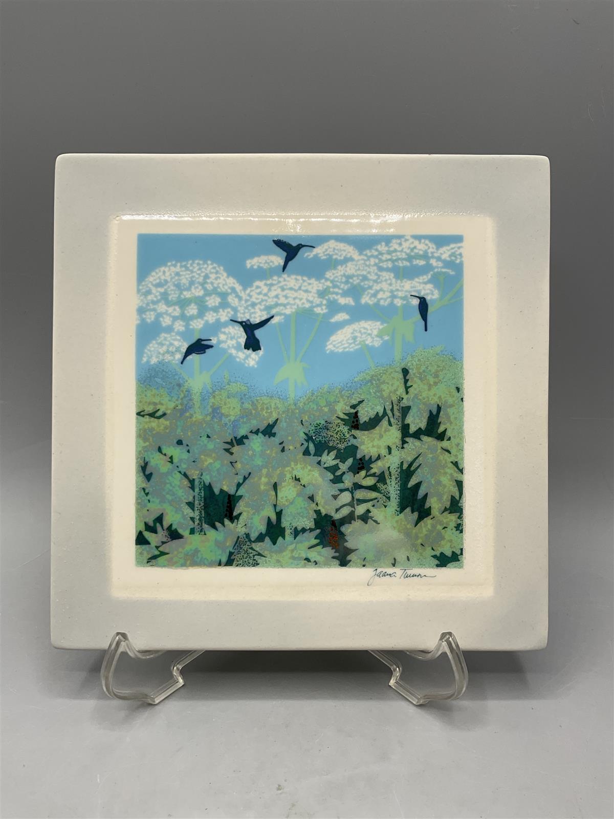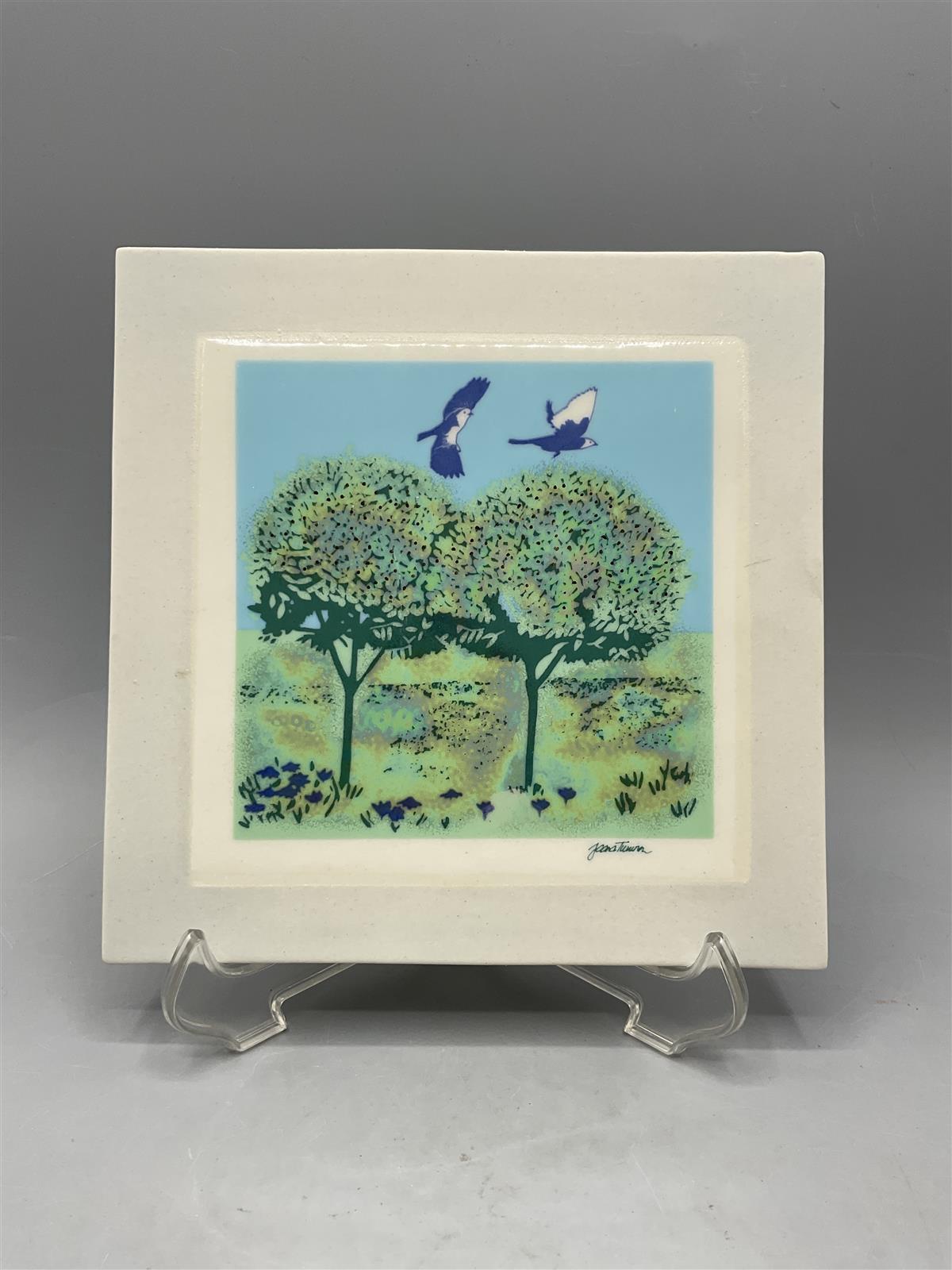 Kaksi kaunista seinälaattaa, joissa on luonnonläheinen kuviointi. Laatat esittävät lintuja ja puita.